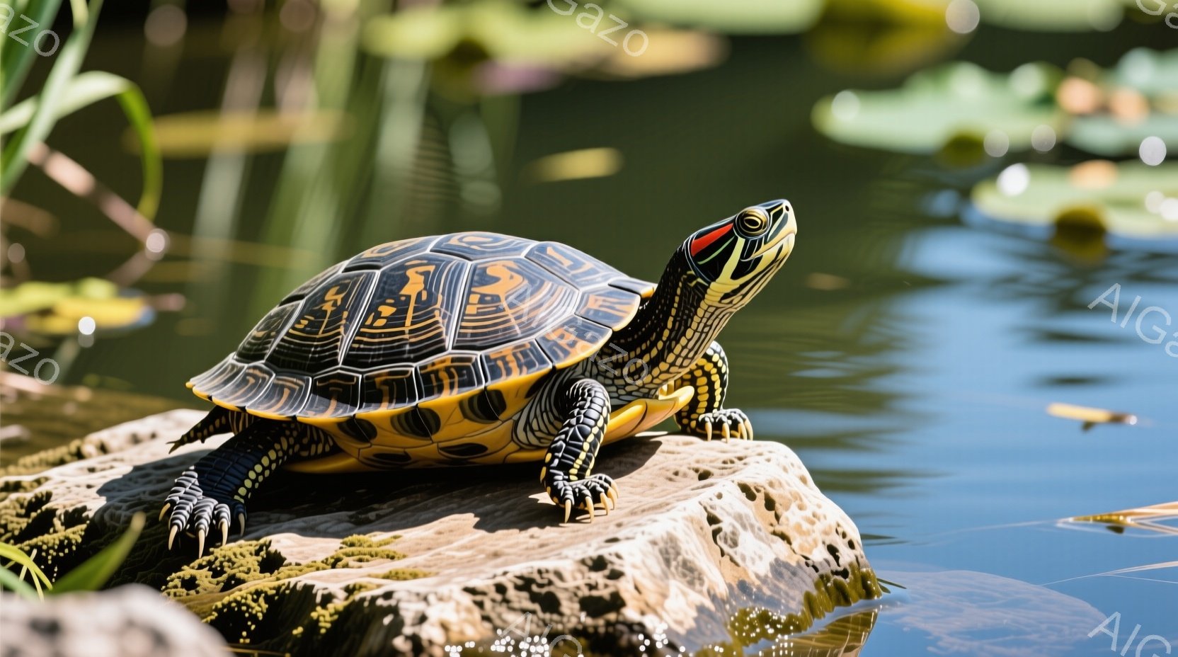 明るい日差しの下、甲羅が美しい特定種類のカメが岩の上に佇んでいます。鮮やかな黄色と黒の模様が特徴的で、表情は穏やかです。背景には水面が広がり、穏やかな自然の雰囲気が漂っています。