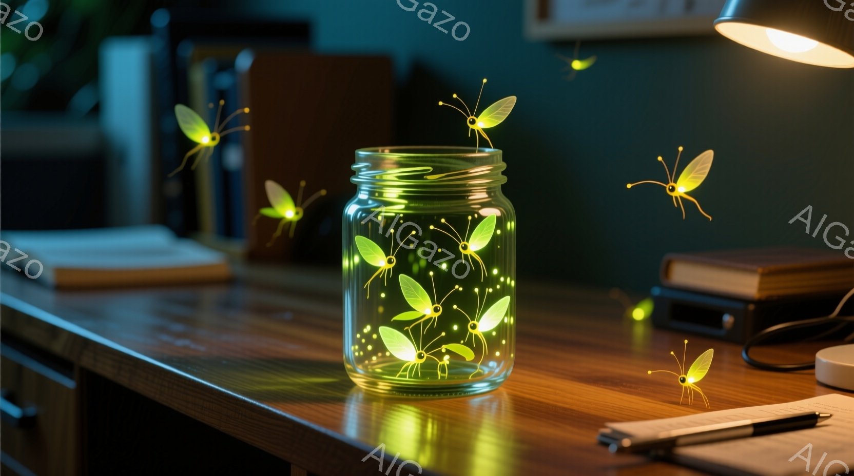 光る植物が瓶の中に閉じ込められ、幻想的な光を放っている。瓶は木製のテーブルの上に置かれ、背後にはぼやけたコンピューターモニターと紙が見える。 全体的に、暖かく、穏やかで、少し神秘的な雰囲気が漂っている。