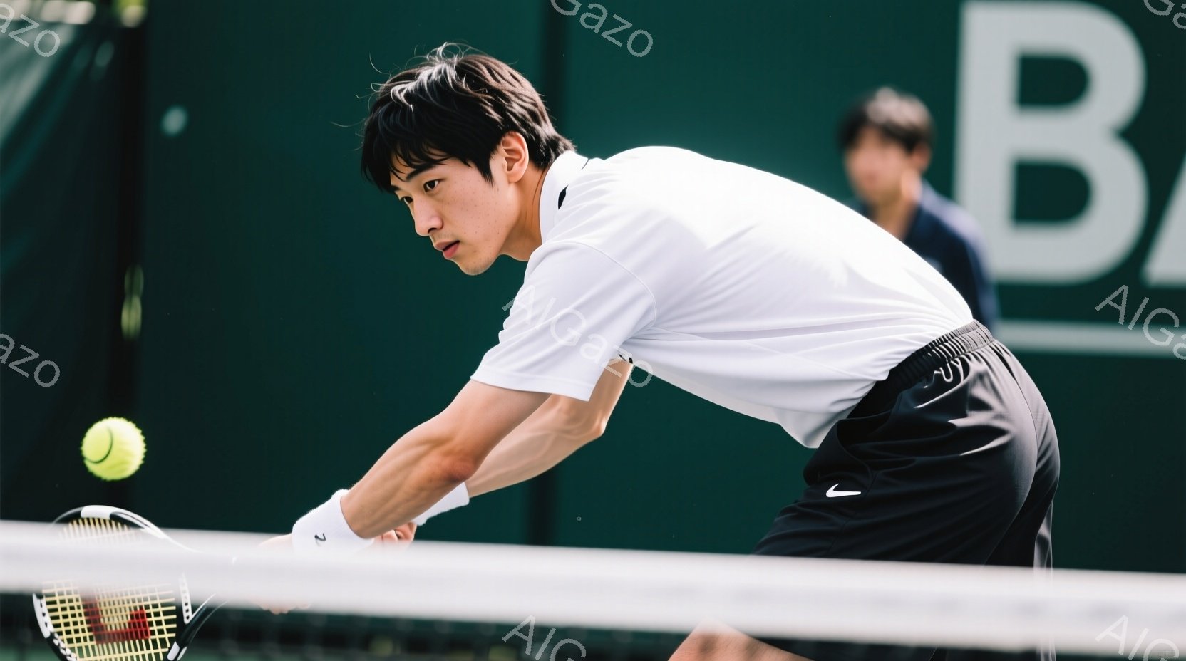 テニス選手がフォアハンドショットを打つ瞬間を捉えた写真です。黒髪で短く整えられた髪型、白いポロシャツと黒いショーツ姿で、集中した表情でボールに目を光らせています。背景は緑の芝生とネット、そしてぼやけた建物があり、晴れた日の屋外テニスコートの様子が伝わってきます。
