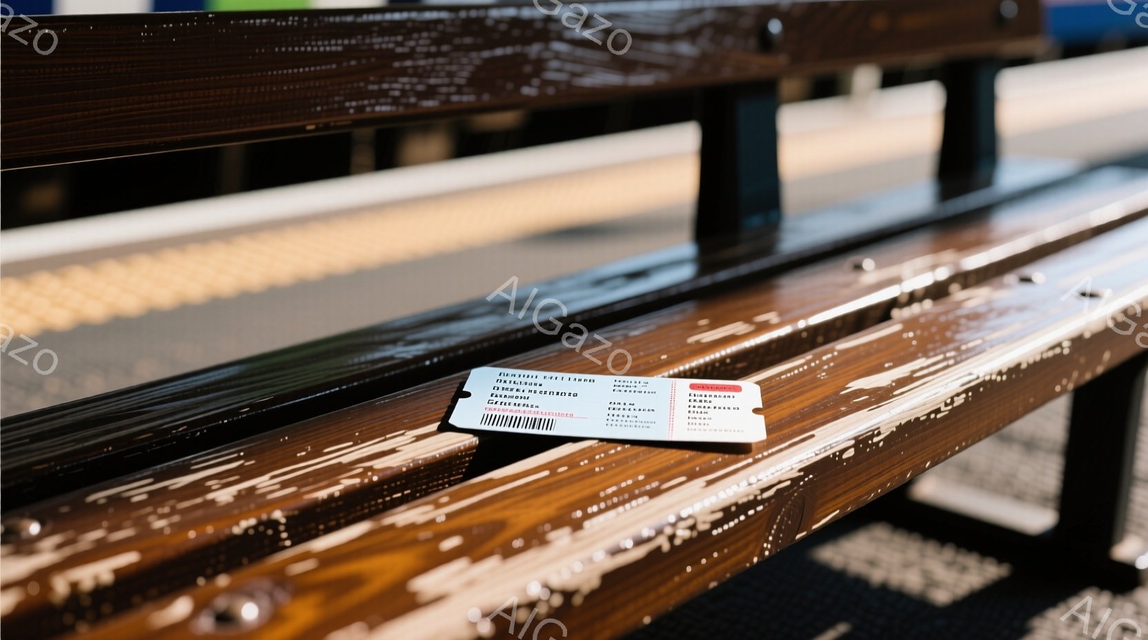 木製のベンチの上に、鮮やかなオレンジ色の入場券が置かれています。背景には、ぼやけた線路と、何台かの白い電車が見え、鉄道駅のプラットフォームであると考えられます。 全体的に暖かく、静かな雰囲気で、何かの旅立ちや移動を予感させる写真です。