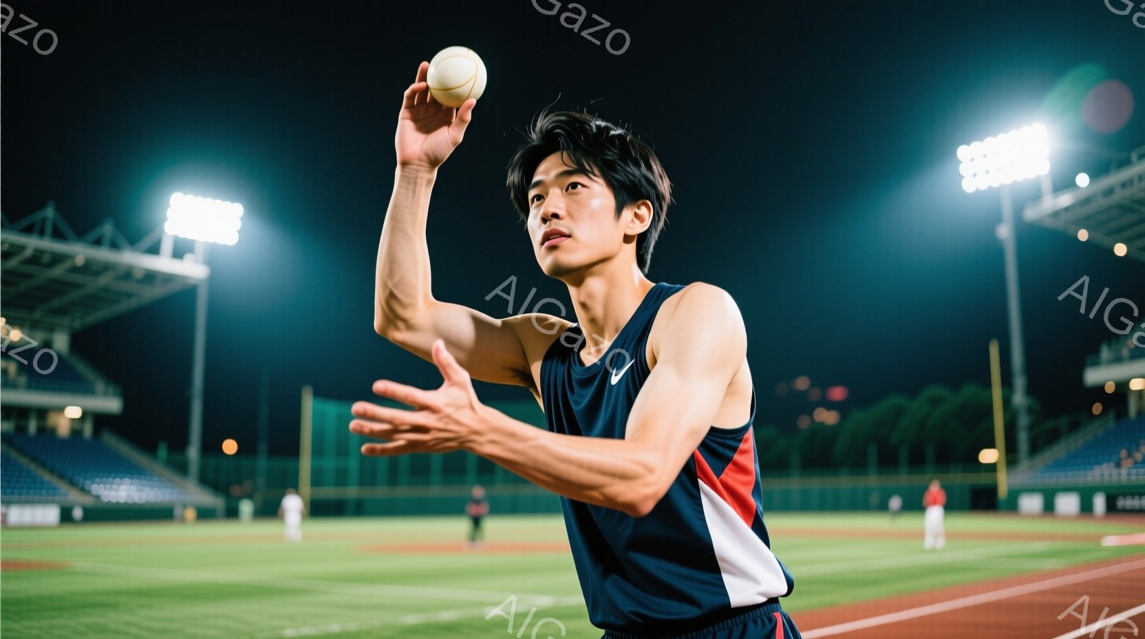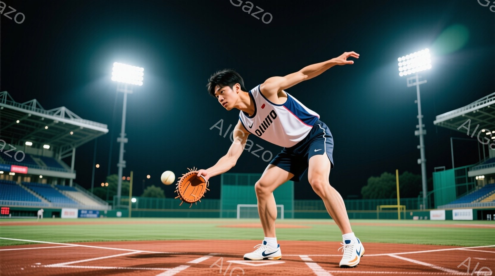 紺色の野球ユニフォームを着た若い男性が、野球のボールを投げる動作をしています。彼は黒髪で、顔には集中した表情が浮かび、腕を大きく振りかぶってボールを離そうとしています。背景には夜間の野球場があり、観客席や照明がぼんやりと見え、競技場の熱気を感じさせる一枚です。