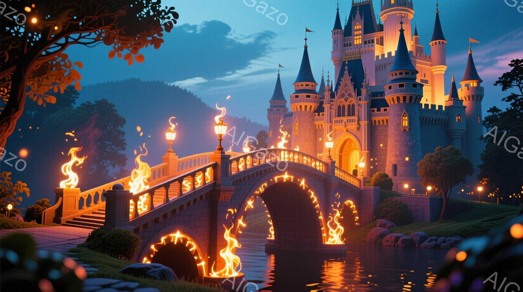 美しいお城が水に囲まれた丘の上にそびえ立ち、アーチ橋がその城へと繋がっています。橋と城の周りには、炎が燃え盛る幻想的な装飾が施され、夜空には満月が輝き、周囲の自然は暗闇に包まれ、神秘的な雰囲気を醸し出しています。人物はシルエットで見え、城の美しさを際立たせています。