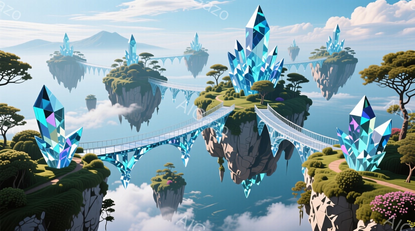 浮遊する島々が連なり、それぞれの島には巨大なクリスタルがそびえ立っています。白いアーチ状の橋が島々を結び、ファンタジー世界の壮大な景色を作り出しています。背景には雲海が広がり、穏やかで神秘的な雰囲気を醸し出しています。