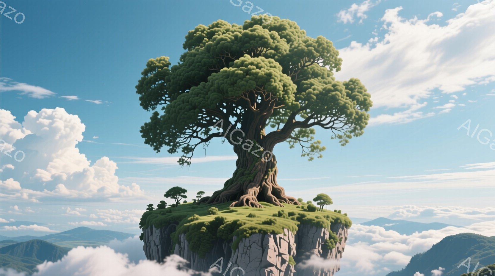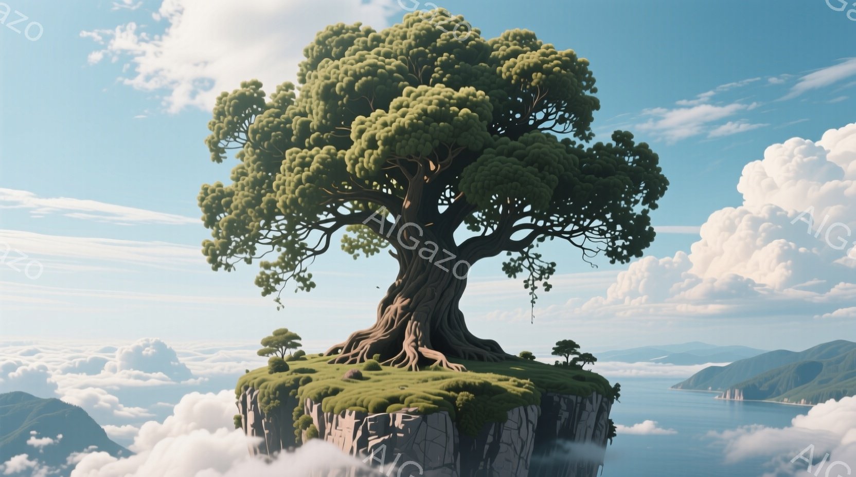 空中に浮かぶ緑豊かな島に、巨大な古木がそびえ立っている。根は島全体に広がり、緑の草と小さな木々が生い茂っている。背景には、青い海と遠くに見える山々が広がり、白い雲が空を覆っている。
