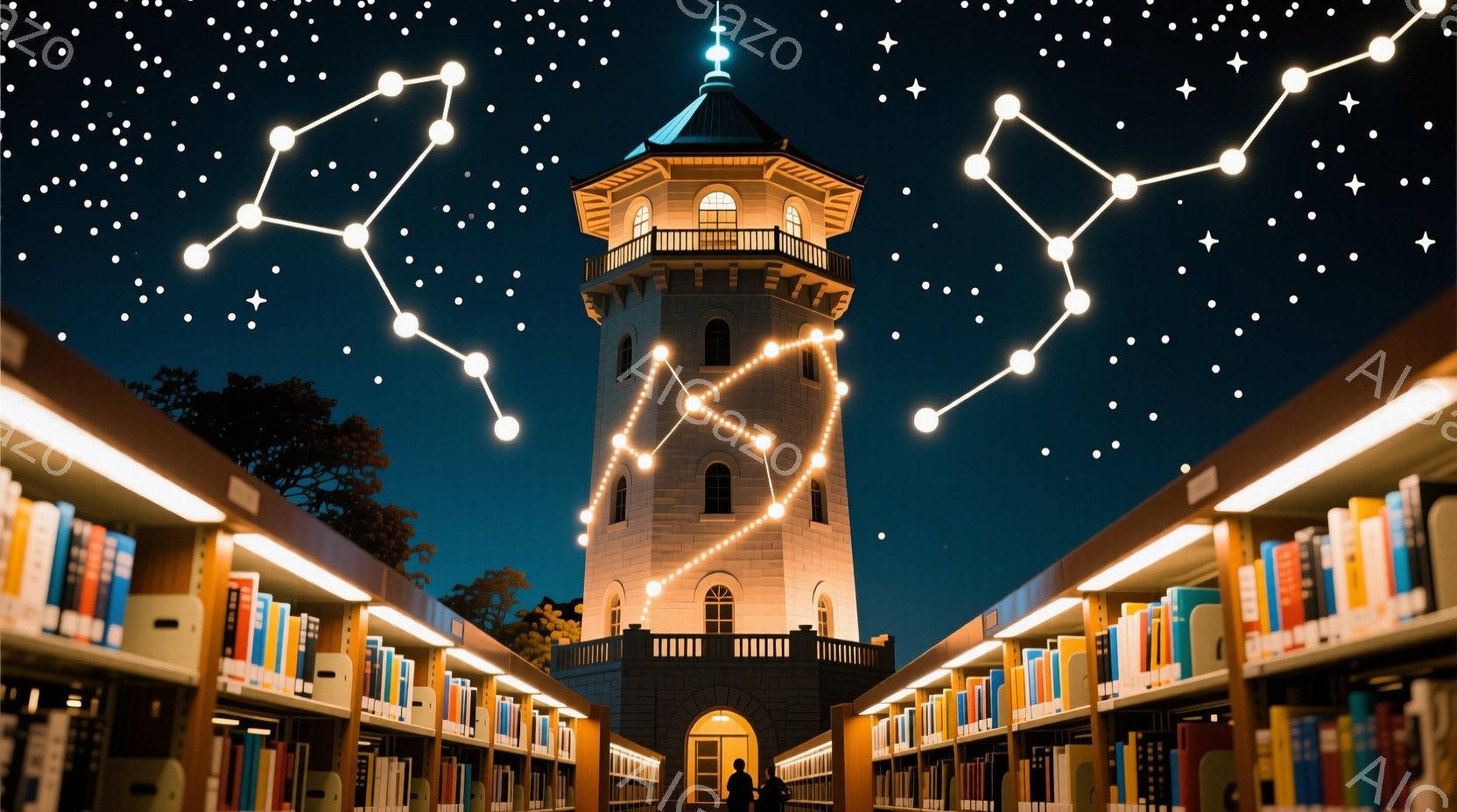 夜空を背景に、図書館のような場所からそびえ立つ塔が写っている。塔は暗いレンガ造りで、各階に窓があり、内部は明るく照らされている。周囲には本棚が並び、天井からは暖色系の照明が灯り、星空と合わせて幻想的な雰囲気を醸し出している。
