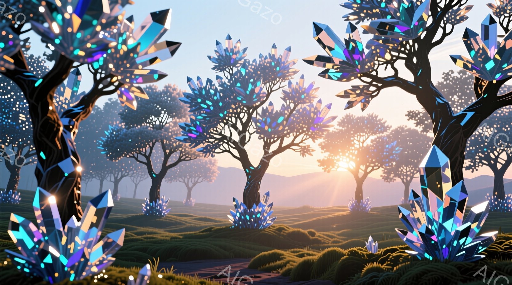 霧に包まれた森林が広がり、その中に尖った結晶のような形をした木々が群生している。地表からは同様の結晶が立ち並び、夕焼けの光を反射して幻想的な輝きを放っている。 全体的に穏やかで神秘的な雰囲気が漂い、まるで夢の中にいるような感覚を覚える。