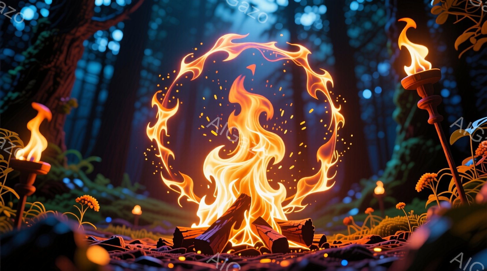 燃え盛る暖炉が、精巧な光の装飾で囲まれています。背景は緑豊かな森で、様々な花やキノコが生い茂り、幻想的な雰囲気を醸し出しています。暖炉の炎はオレンジと黄色の鮮やかな色彩で、木々の緑と対照的に、神秘的な光を放っています。