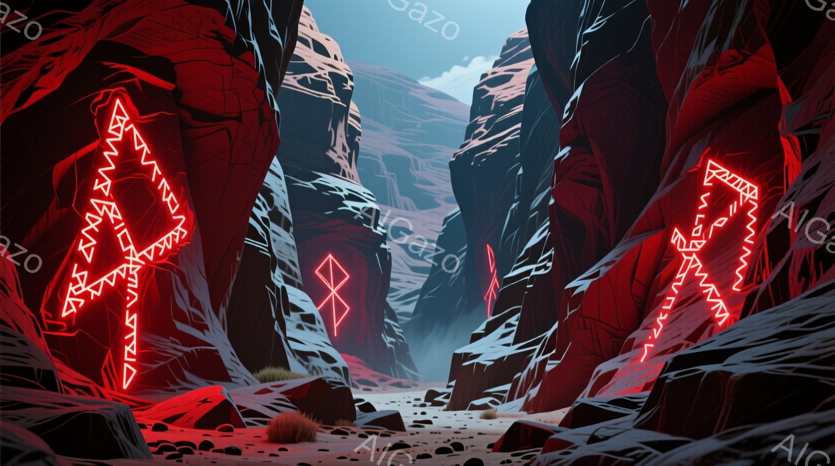 赤茶色の険しい岩壁が両側高くそびえ立ち、そこには発光する赤い象形文字が刻まれています。谷底には薄い霧が立ち込め、遠くにはかすかな光が見え、神秘的な雰囲気を醸し出しています。全体的に、古代遺跡や異世界に通じるような、重厚で幻想的な情景が描かれています。