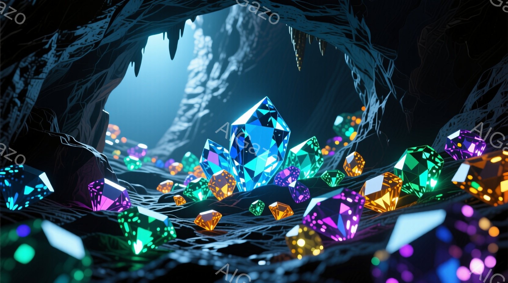 暗い背景に、多様な色の結晶が散らばり、まるで星屑のような光を放っている。鮮やかな青、紫、黄色、緑色の結晶は、独特の形状をしており、その光が周囲の暗闇を照らし出している。全体的に幻想的で神秘的な雰囲気が漂い、まるで宝の洞窟の中にいるような感覚を覚える。