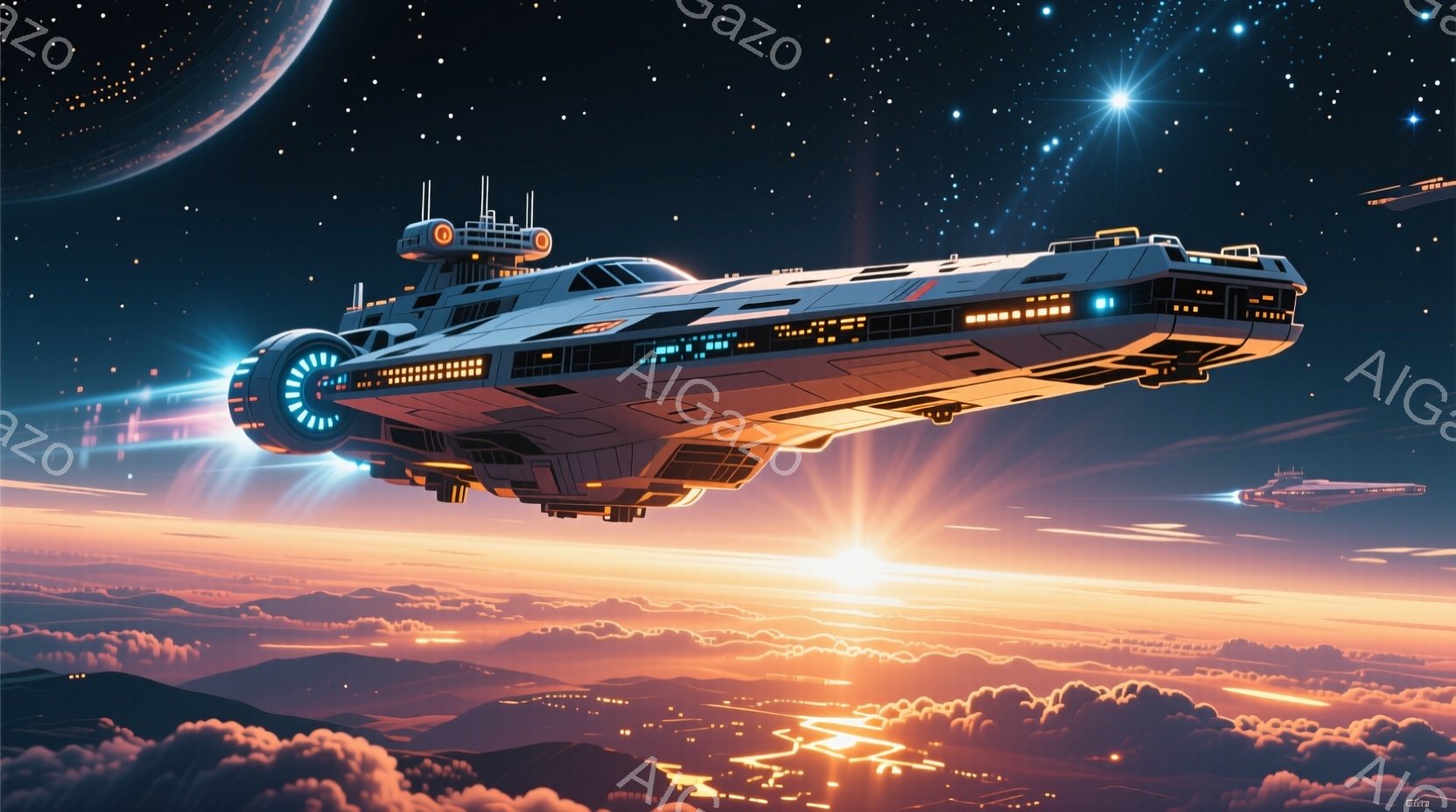 巨大な未来的な宇宙船が雲海を駆け抜けている様子が描かれています。船体は灰色で、青とオレンジの光が点在し、推進力のあるエンジンから青い光が放出されています。背景には、地球のような惑星と、他の宇宙船、そしてきらめく星々が広がり、壮大で神秘的な雰囲気を醸し出しています。