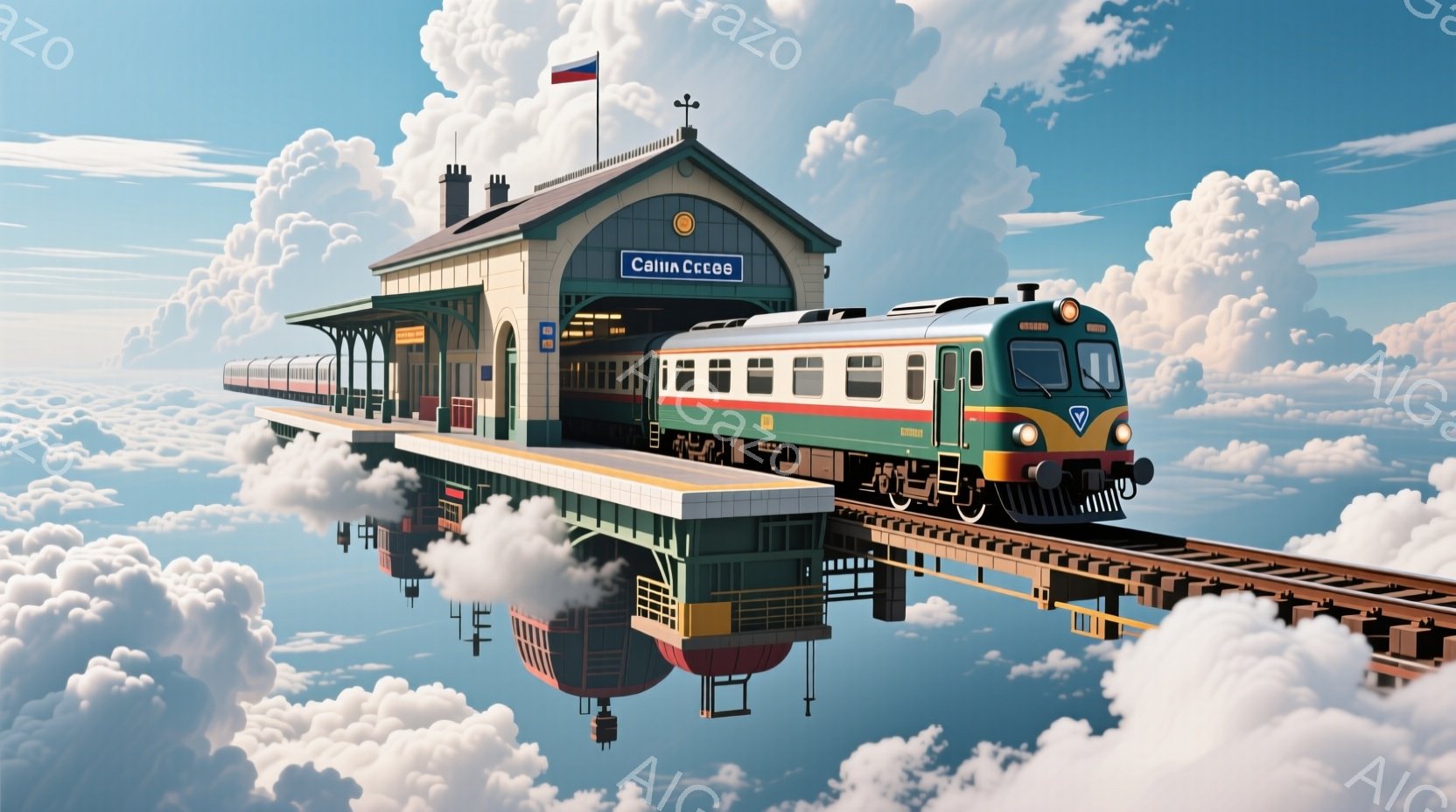 空中に浮かぶ線路と駅舎が印象的な風景です。駅舎はレトロなデザインで、オレンジと白の配色が特徴的です。周囲には雲が広がり、遠くには風船のような物体がいくつか浮かんでおり、幻想的な雰囲気を醸し出しています。