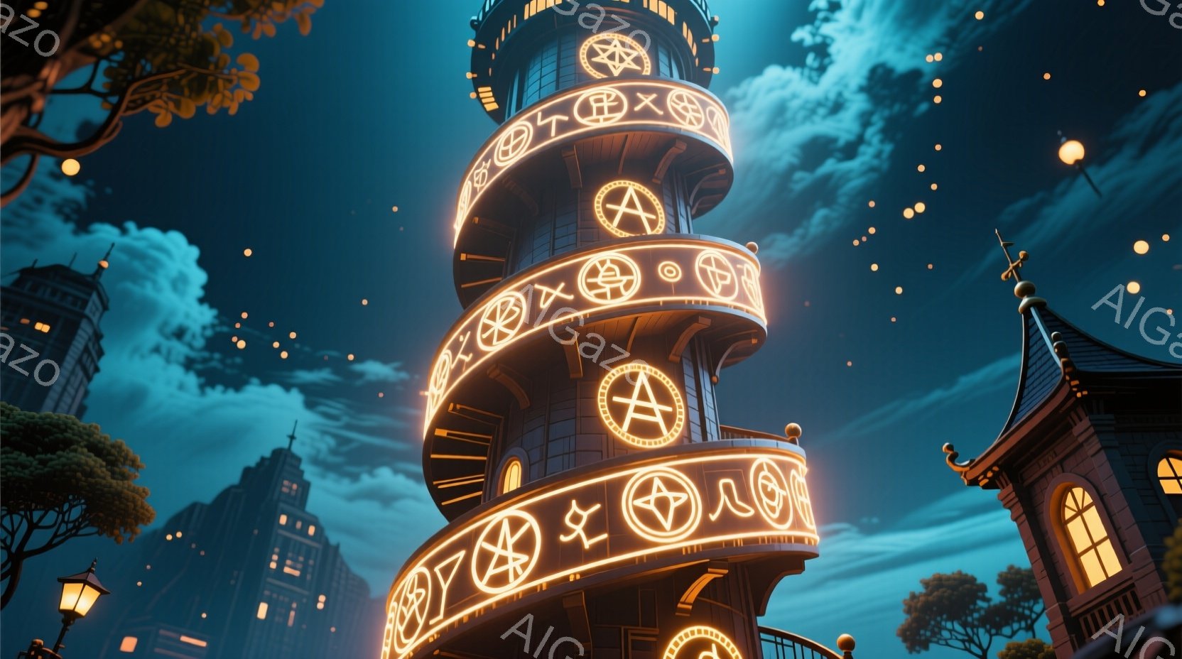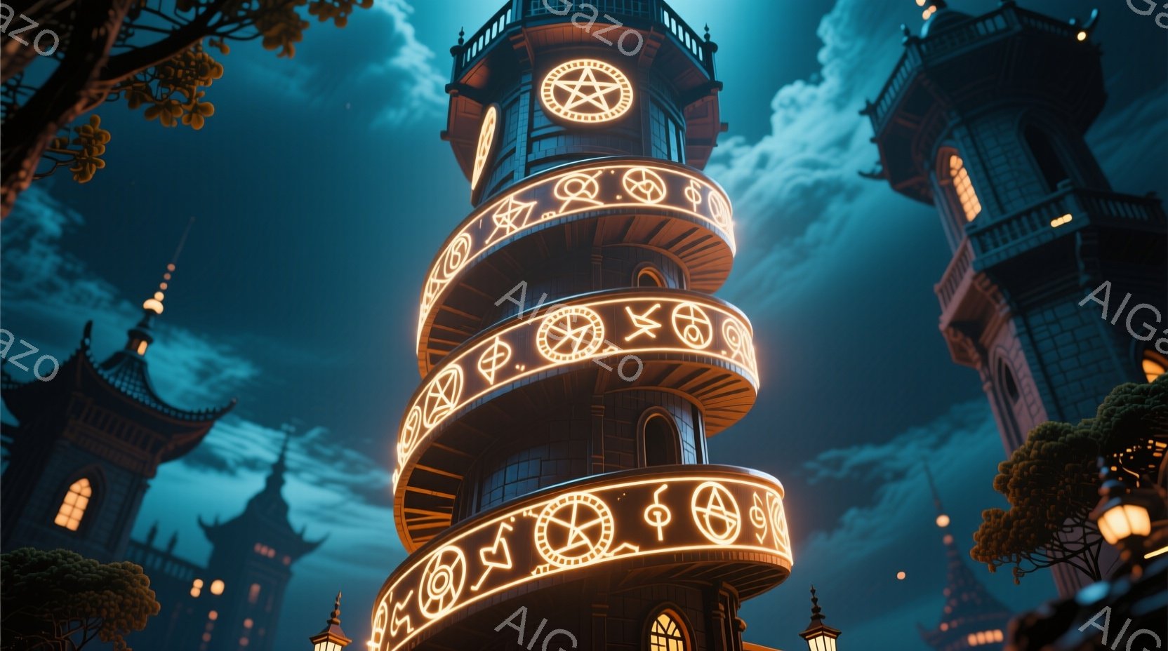 鮮やかな青色の空を背景に、複雑な紋様が刻まれたオレンジ色の塔が螺旋状に伸びています。塔には独特な記号が光り輝き、夜空には星のような光が散りばめられています。 全体的に神秘的で幻想的な雰囲気が漂い、どこか中世の魔法都市を思わせる光景です。