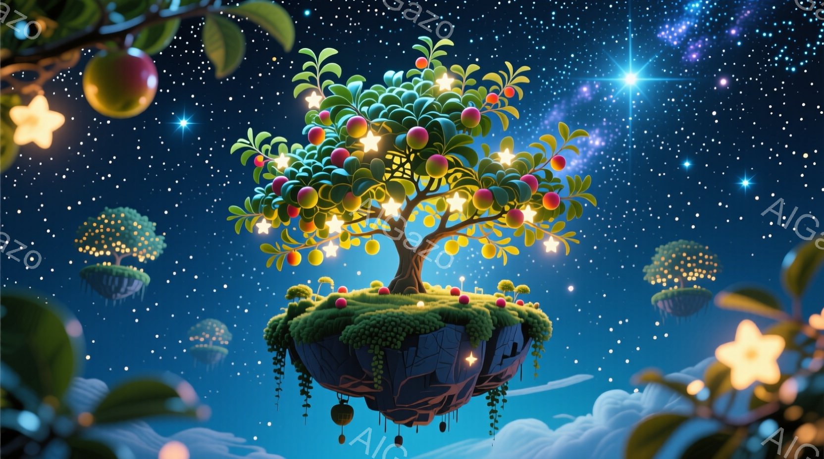 夜空を背景に、浮遊する島々が幻想的な光景を作り出している。各島には緑豊かな草が生い茂り、根を張った木々がカラフルな実を付けている。島々は淡い光を放ち、星空とのコントラストが神秘的な雰囲気を醸し出している。