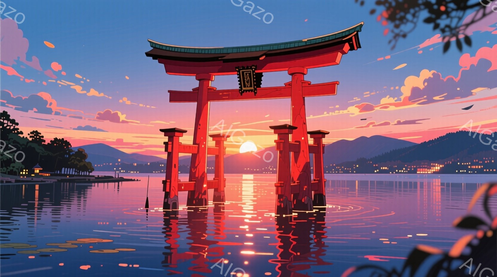 朱色の鳥居が水面に浮かび、夕焼け空と水面に鮮やかな反射を映し出している。背景には、ぼんやりとした山並みと、遠くに見える小さな建物が並び、穏やかで幻想的な雰囲気を醸し出している。空はオレンジ色と紫色のグラデーションで、静かで平和な時間が流れているように感じられる。