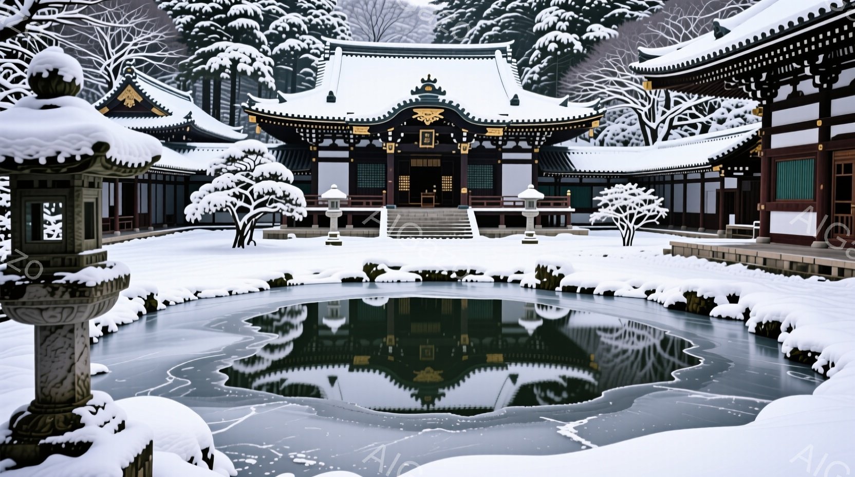 凍てつく冬の庭園には、雪に覆われた建物と池が広がっています。池の水面には建物や灯籠が映り込み、静寂な冬の風景を作り出しています。雪景色は白銀の世界で、まるで時間が止まったかのような穏やかな雰囲気を醸し出しています。