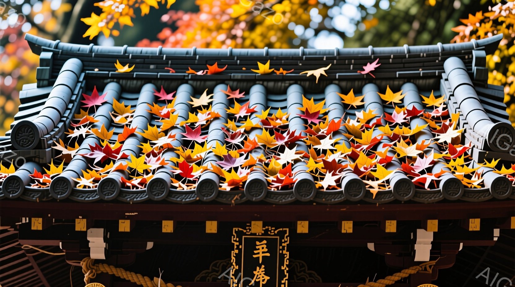 鮮やかな紅葉が寺院の屋根を覆い尽くし、秋の深まりを感じさせる美しい光景である。屋根瓦の間から覗く装飾や提灯、そして屋根に刻まれた文字が、歴史ある寺院の風格を際立たせている。背景には緑豊かな木々が見え、秋晴れの空の下、穏やかで静謐な雰囲気が漂っている。