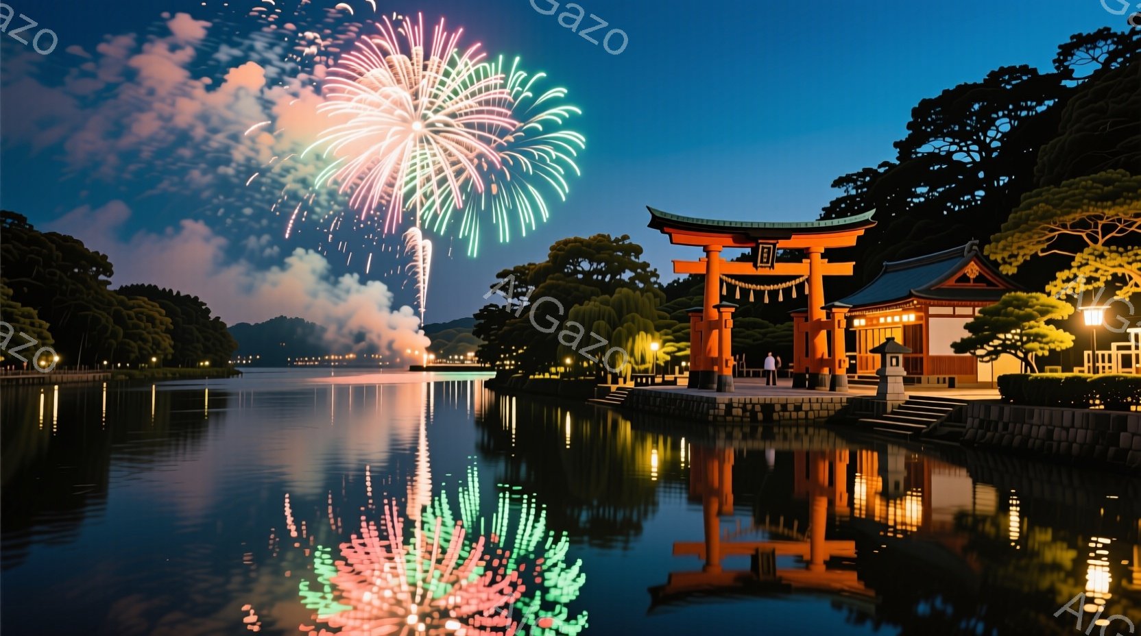 夜空には鮮やかな花火が咲き乱れ、水面にその光が反射して幻想的な光景を作り出しています。朱色の鳥居と古い建物が水辺に佇み、周囲の緑豊かな木々がその風景を囲み、静かで神秘的な雰囲気を醸し出しています。夜の闇と鮮やかな光、そして歴史的な建造物が調和し、日本の伝統的な美しさを表現しています。
