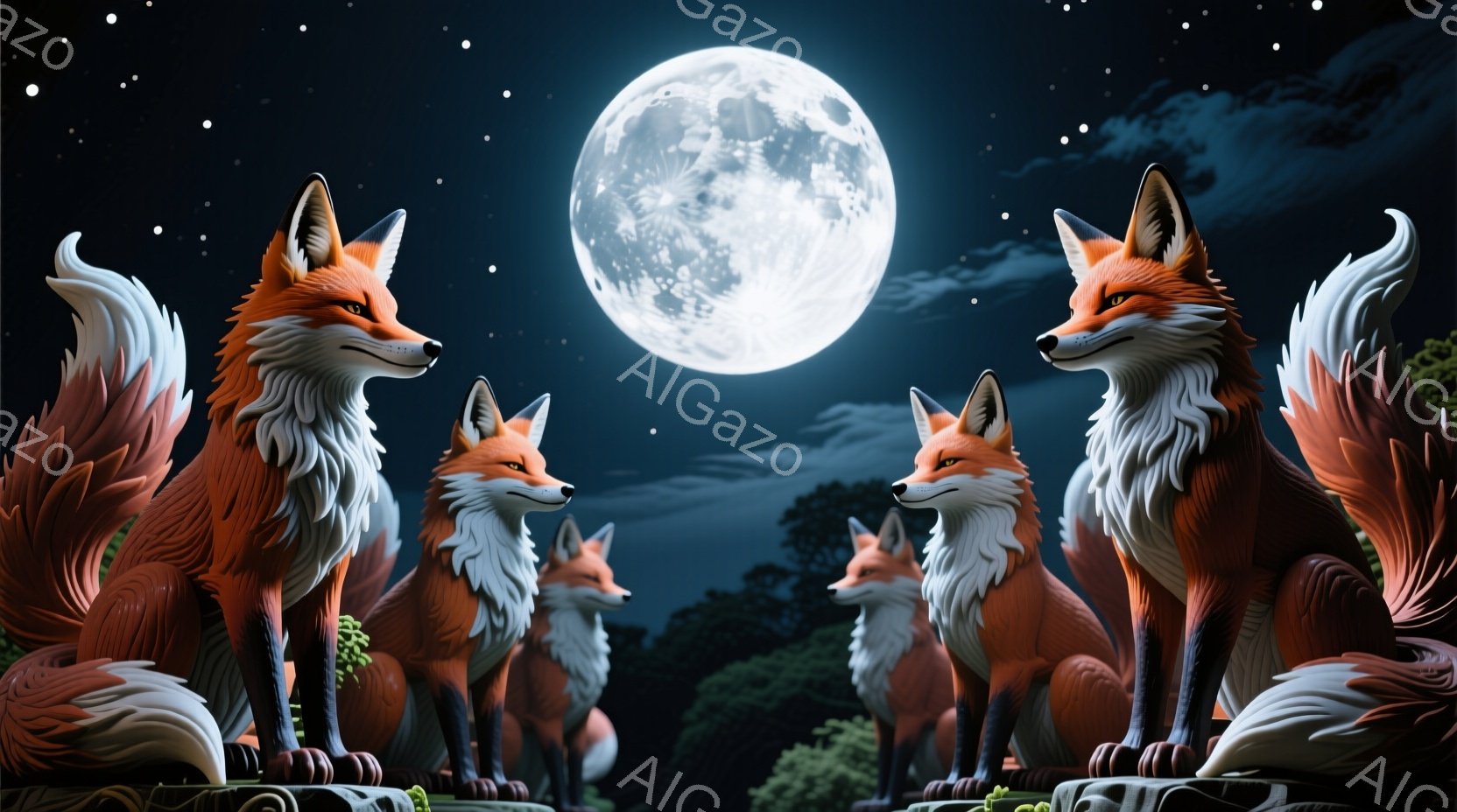 鮮やかなオレンジ色の毛並みを持つ狐が二匹、灰色の狐と共に、夜空を背景に描かれている。彼らは高い台座の上に座っており、月明かりの下で互いに向き合っているように見える。夜空は暗く、遠くに見える星々と満月が神秘的な雰囲気を醸し出している。