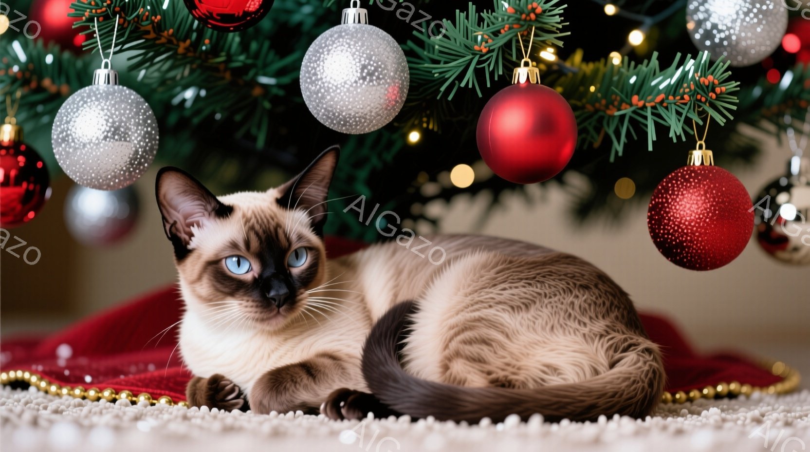 シーラーミックスの猫が、ふわふわの白いカーペットの上に横たわっています。背景には、赤いオーナメントとキラキラ光る電飾で飾られたクリスマスツリーがあり、猫の青い瞳を際立たせています。全体的に、暖かく穏やかなクリスマスの雰囲気が漂う、魅力的な光景です。