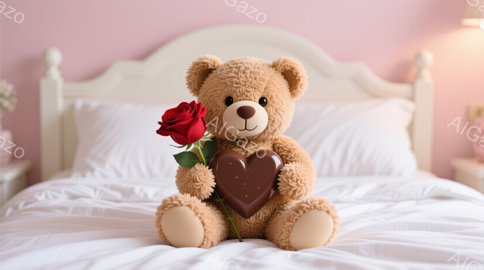 ふわふわの茶色のテディベアが白いベッドの上に座っており、片手にチョコレートのハート、もう片手に赤いバラの花束を持っています。背景には、淡い緑色の壁と木製のベッドフレームが見え、暖かく優しい雰囲気を醸し出しています。全体的に、バレンタインデーや愛情表現を連想させる、ロマンチックで可愛らしい光景です。