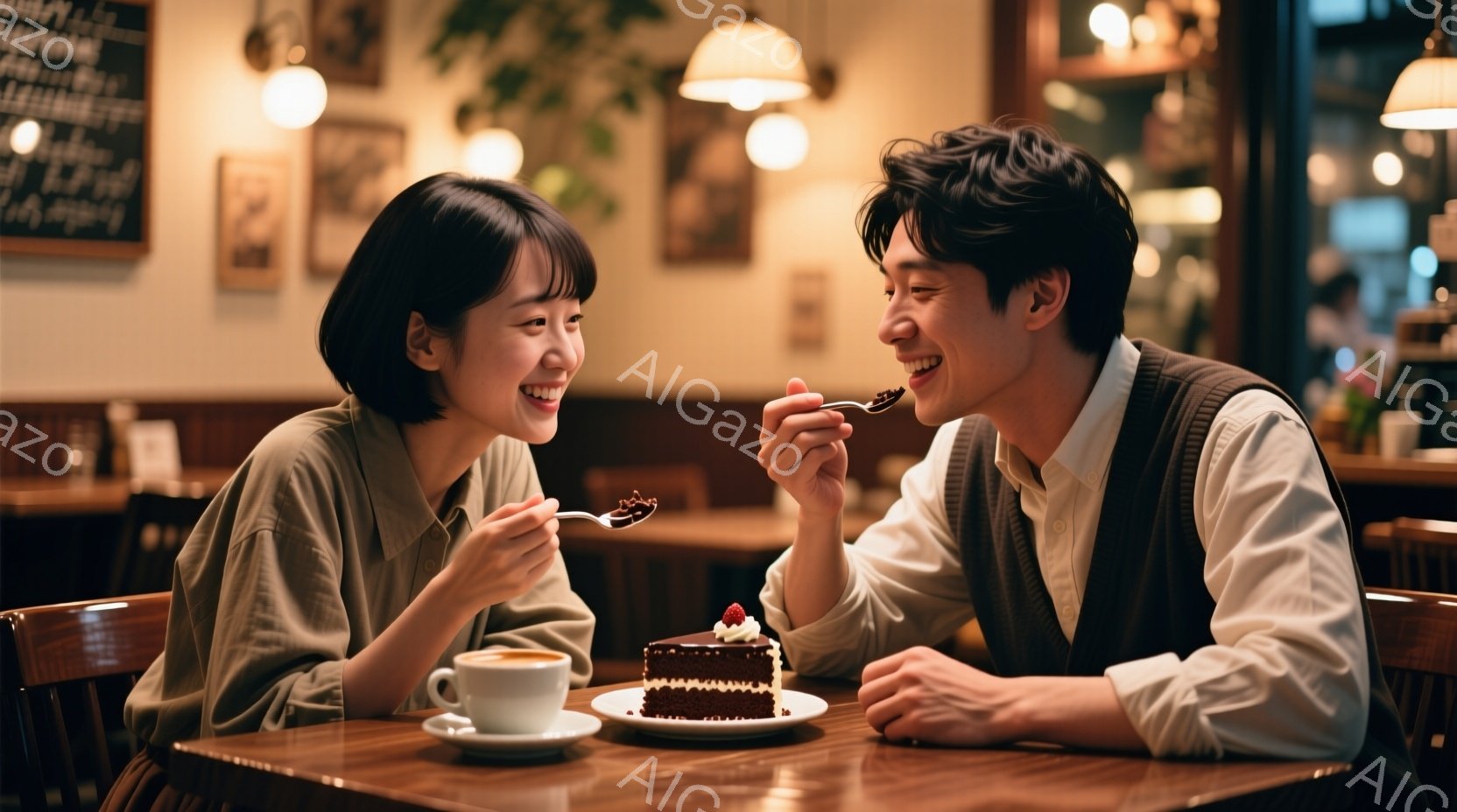 若い男女がカフェでケーキを分け合って微笑んでいます。女性は茶色の短い髪で、ベージュ色のシャツを着ており、男性は黒髪で、青いシャツを着ています。背景には、ぼやけたカフェの様子が見え、暖かく親密な雰囲気が漂っています。