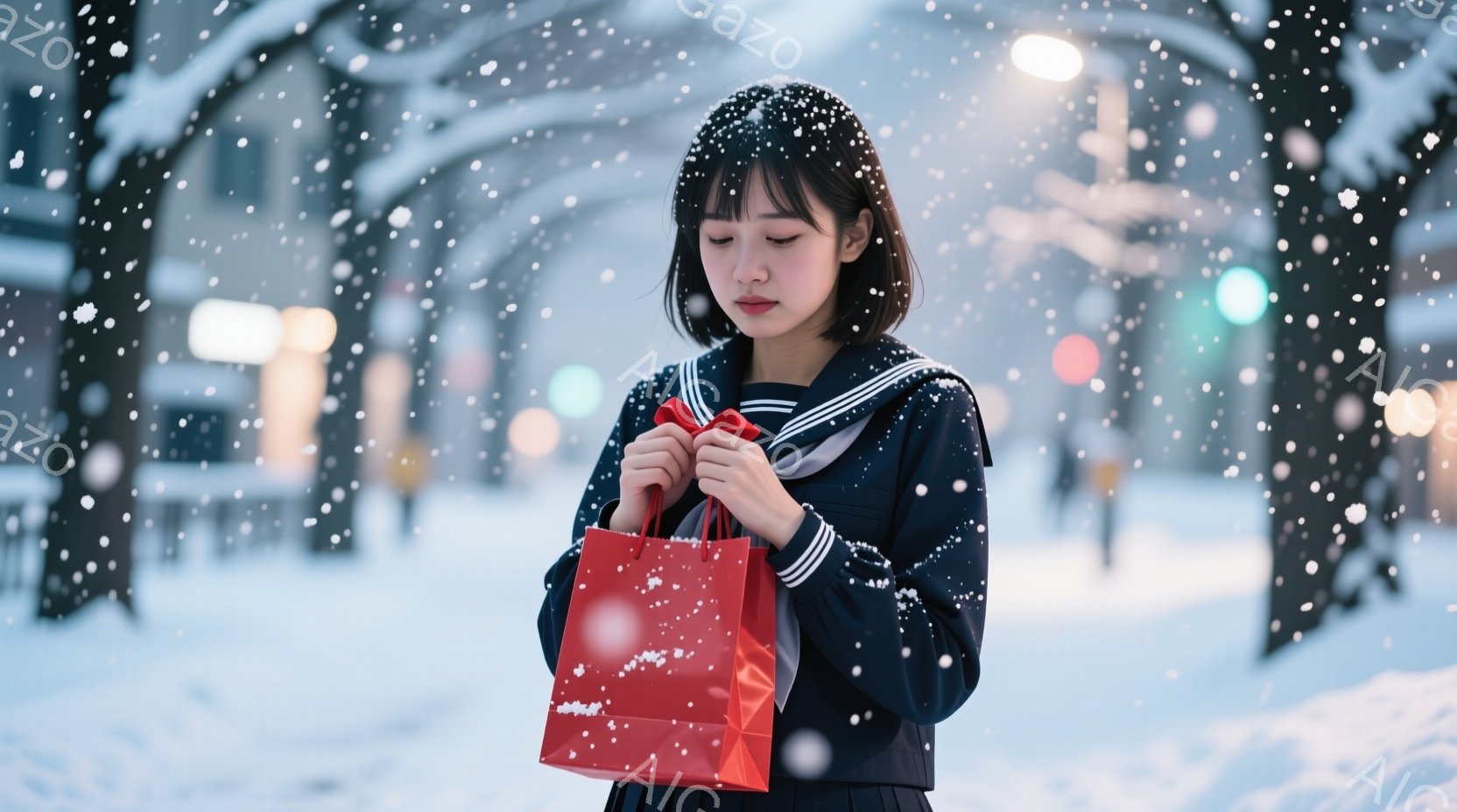 雪が降る夜、セーラー服を着た若い女性が赤いギフトバッグを持っています。彼女は少しうつむき、どこか物憂げな表情を浮かべており、冷たい冬の夜を彷彿とさせます。背景にはぼやけた街灯と雪に覆われた木々が見え、静かで少し寂しげな雰囲気を醸し出しています。