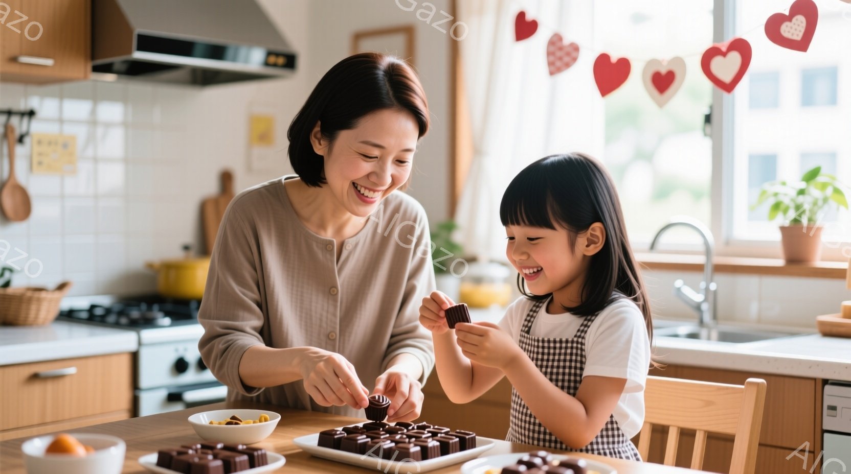 明るいキッチンで、エプロンをつけた女性と、チェック柄のワンピースを着た幼い女の子がチョコレートを作っています。女性はチョコレートをトレイに並べ、女の子はチョコレートを手に持って嬉しそうに微笑んでいます。背景には食器や植物が見え、全体的に温かく、幸せな雰囲気が漂っています。