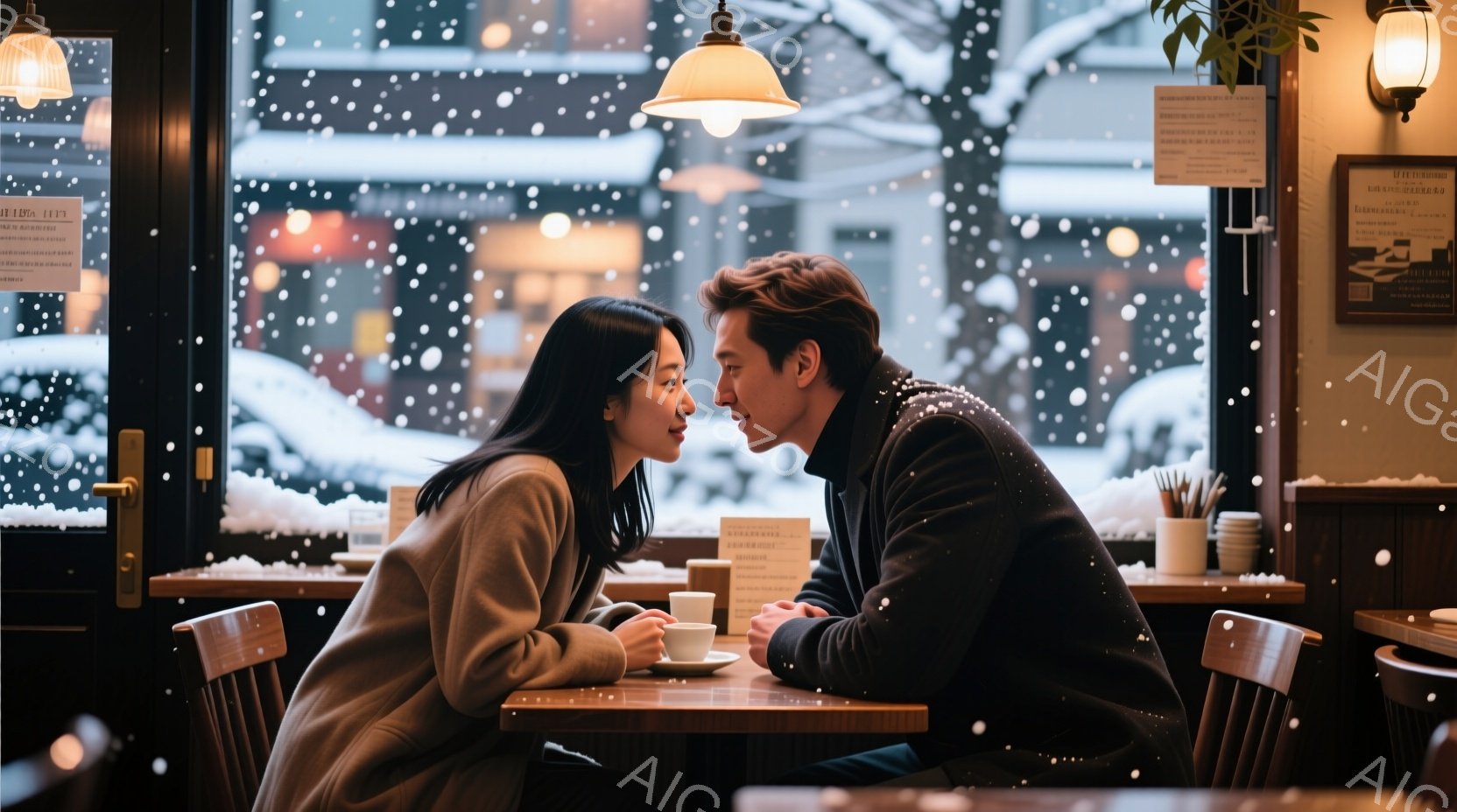 暖炉のあるカフェで、若い男女が向かい合って座っています。女性は長い黒髪でベージュのセーターを着ており、男性は濃い髪で紺色のジャケットを着ています。二人は互いに微笑み合い、手をつないでおり、外は雪が降り積もる冬の景色が広がっています。