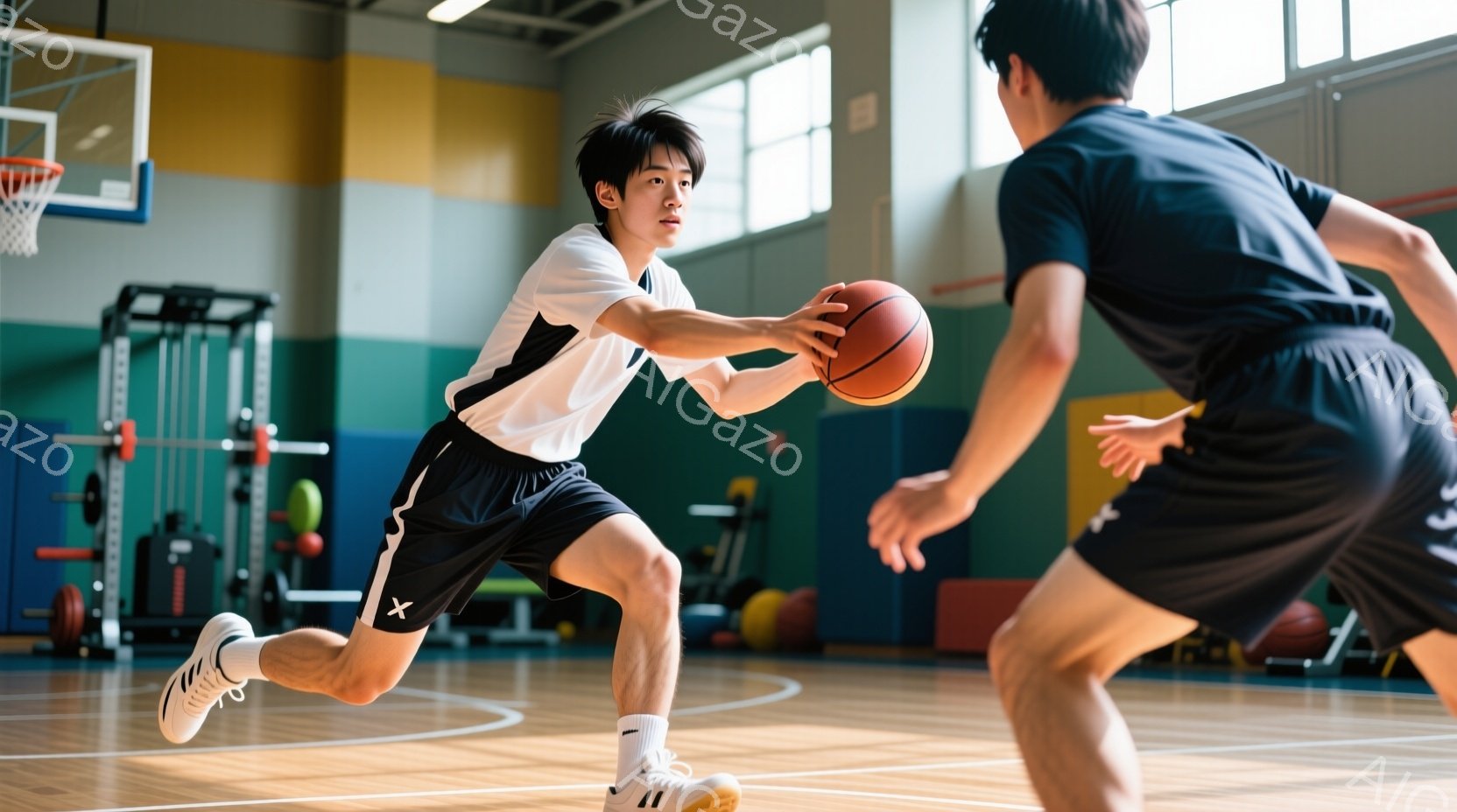 競技場のような体育館で、黒髪の若い男性バスケットボール選手が、ドリブルしているボールに向かって体を低く構え、片手を伸ばしてボールに触れようとしている。彼は青と赤のユニフォームを着ており、背番号は12番で、背景にはぼやけた観客席と明るい照明が見える。全体的に、活気があり、競技に集中している雰囲気が伝わってくる。