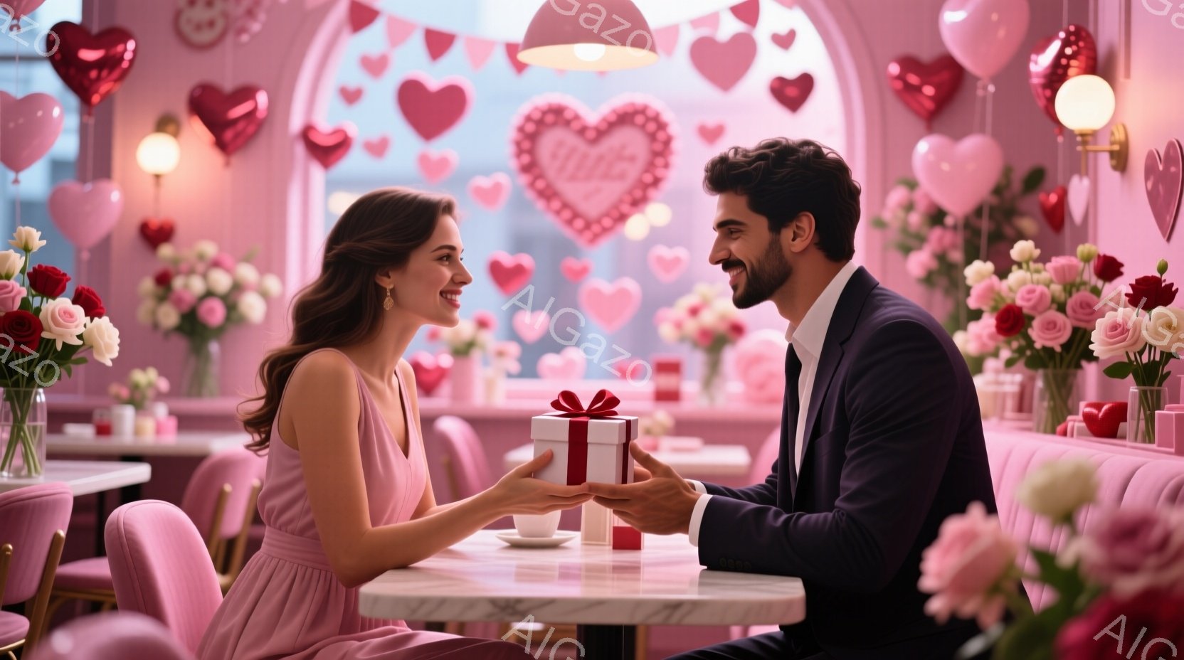 柔らかなピンク色の背景の中で、一対のカップルが愛を交わしています。女性はピンクのドレスを着て髪を優雅にまとめ、微笑みながらプレゼントを受け取ろうとしています。男性は紺色のスーツを着て、温かい笑顔で女性に赤いリボンで結ばれたギフトボックスを手渡しています。