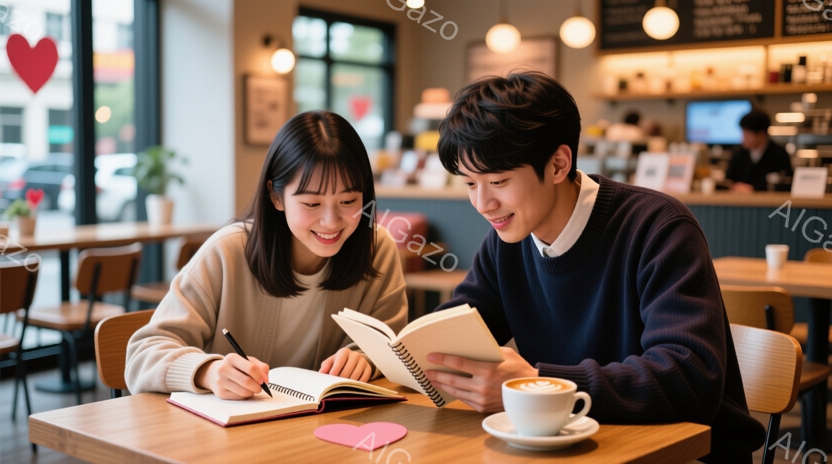 若い男女がカフェの丸いテーブルでノートに何かを書き込んでいます。男性は紺色のセーターを着ており、女性はクリーム色のニットを着ており、二人とも笑顔でノートを見つめています。背景にはカフェのカウンターや他の客が見え、暖かい光が差し込み、明るくリラックスした雰囲気を醸し出しています。