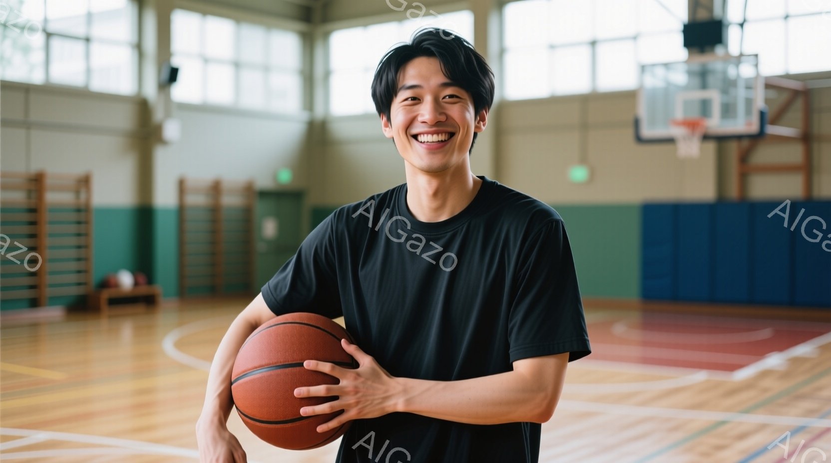 若い男性がバスケットボールを持って笑顔で立っている。彼は黒いTシャツを着ており、短髪で、歯を見せて明るく微笑んでいる。背景は体育館で、バスケットゴールや青と緑の壁が見え、暖かく活気のある雰囲気が漂っている。