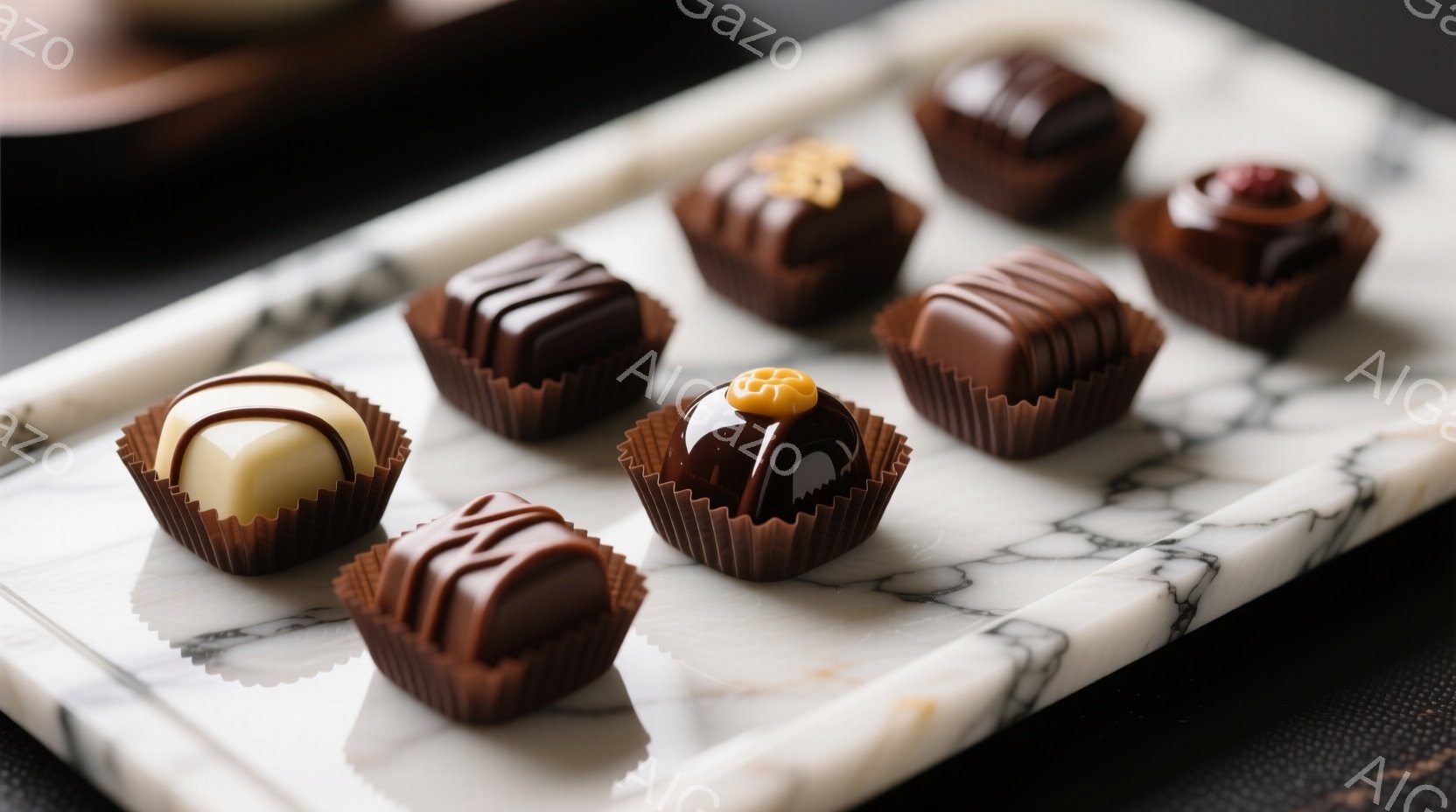 白大理石の台の上に、様々なチョコレートが並べられています。チョコレートはそれぞれ異なる形と装飾が施されており、一部は茶色の紙製のカップに入っています。背景は暗く、チョコレートの美しい色合いと質感が際立っています。