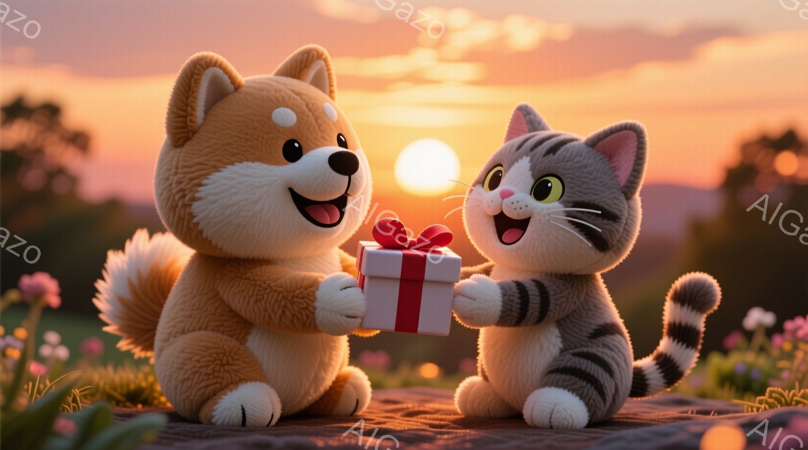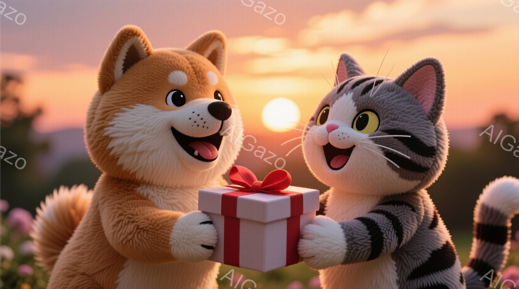 柴犬と猫がプレゼントを交換しています。二匹とも笑顔で、猫は赤いリボンがついた白い箱を受け取ろうとしています。背景には夕焼けの空と花畑が広がり、温かく優しい雰囲気が漂っています。