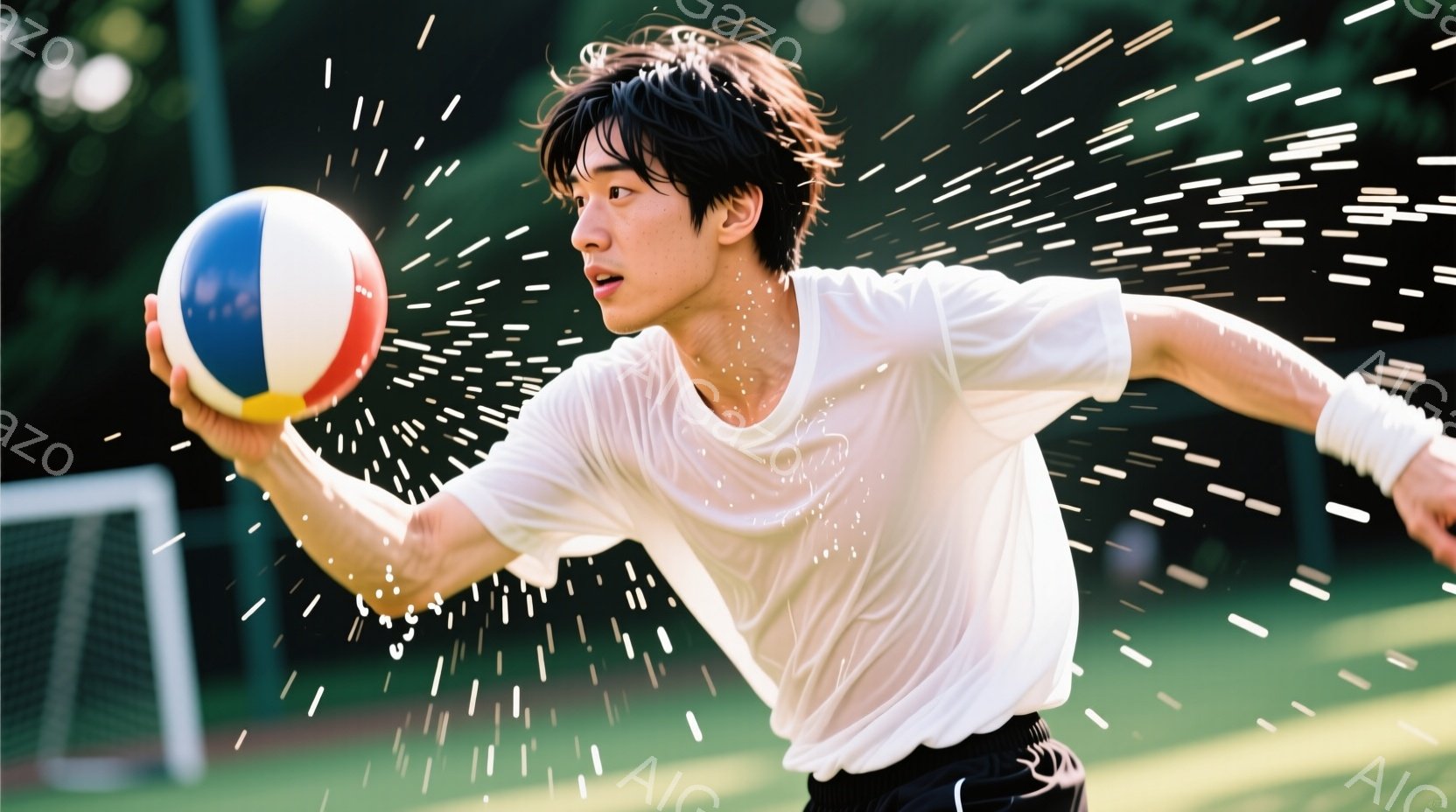 若い男性が、青と赤のボールを片手でキャッチしようとしている躍動的な瞬間が捉えられています。彼は白いTシャツと黒いショートパンツを着用し、髪は無造作に乱れています。背景にはサッカーゴールが見え、周囲には緑豊かな木々が生い茂り、水しぶきが舞っていることから、屋外で運動している最中であることがわかります。