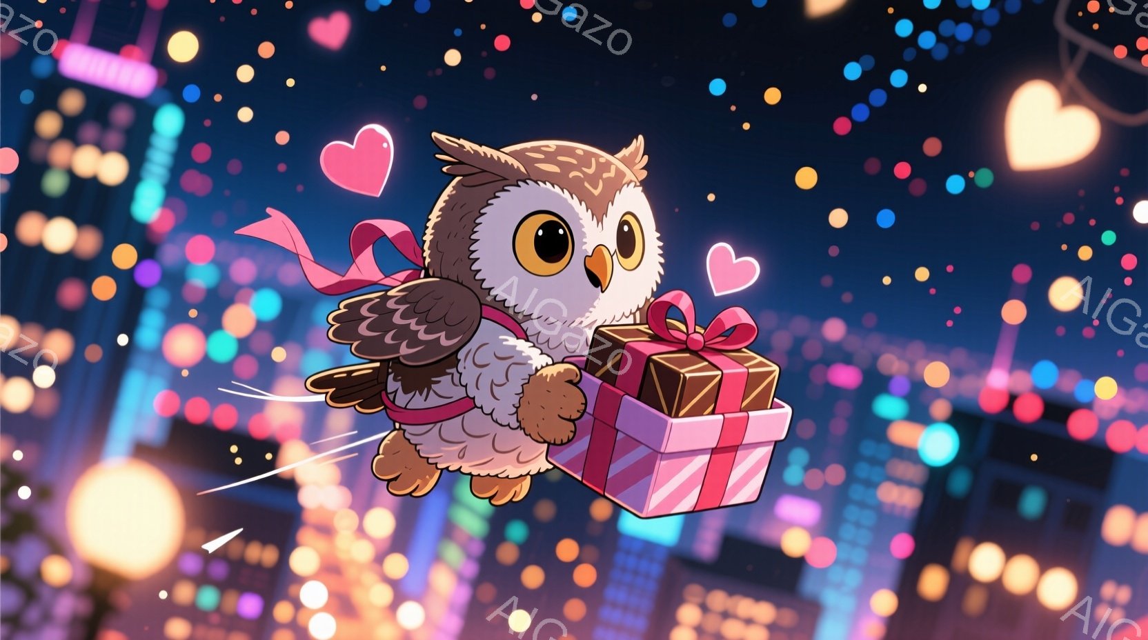 ふわふわのフクロウが、赤いリボンで結ばれたプレゼントの箱を抱えて空を飛んでいます。背景には、ぼやけた光の多い夜景が広がり、建物や街灯が点在しています。ハート型の光が舞い上がり、ロマンチックで温かい雰囲気を醸し出しています。