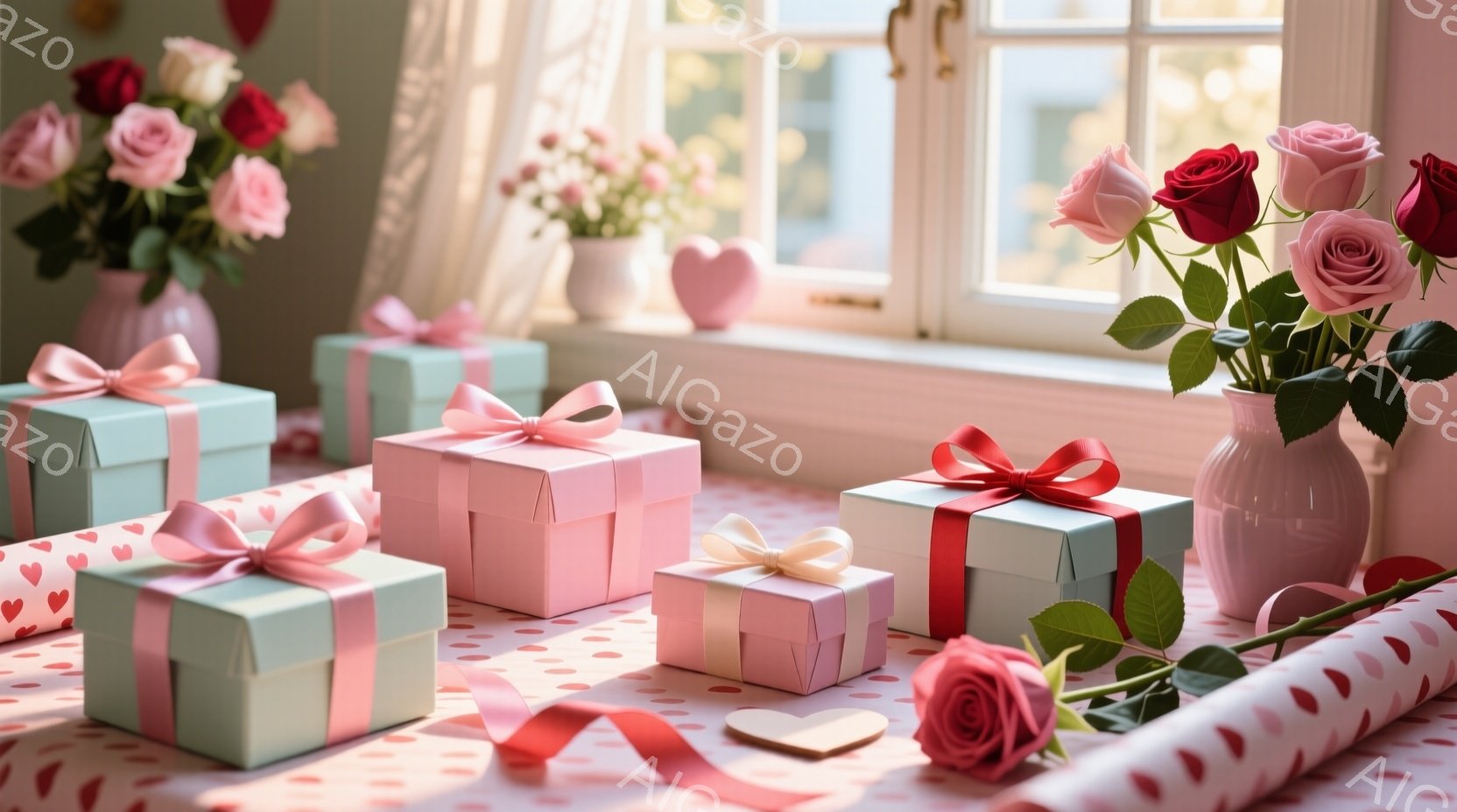 柔らかい光が差し込む室内で、ピンクと水色のプレゼントボックスが並べられています。プレゼントはハート柄のリボンや包装紙で飾られ、バラの花と一緒に飾られています。全体的にロマンチックで優しい雰囲気が漂い、バレンタインデーや誕生日などの特別な機会を連想させます。
