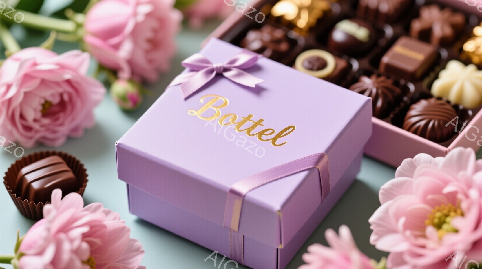 淡い紫色の上品なギフトボックスが、ピンク色のカーネーションに囲まれて配置されています。ボックスには金色の筆記体で「Beritaj」と書かれており、中には様々なチョコレート菓子が整然と並んでいます。全体的に、華やかで甘美な雰囲気が漂い、特別な日の贈り物や贅沢な時間を連想させます。