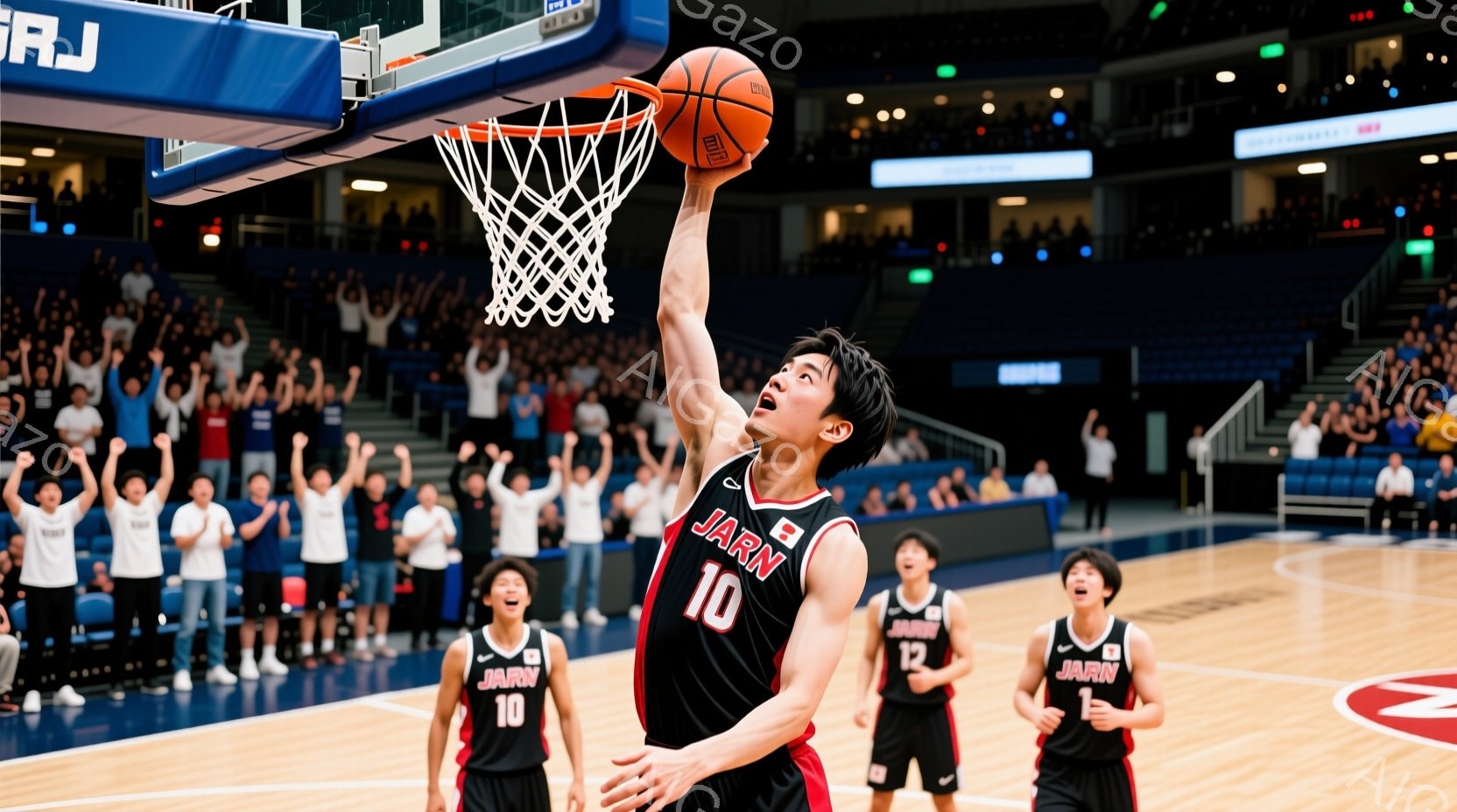 黒いユニフォームに「JAPAN」と背番号2が書かれたバスケットボール選手が、ゴールに向かってジャンプシュートを試みています。彼は髪を短く切り、集中した表情でシュートに臨んでおり、背景には観客席が広がり、興奮した観客が手を挙げて応援しています。競技場の照明が明るく、活気あるスポーツの雰囲気が伝わってきます。