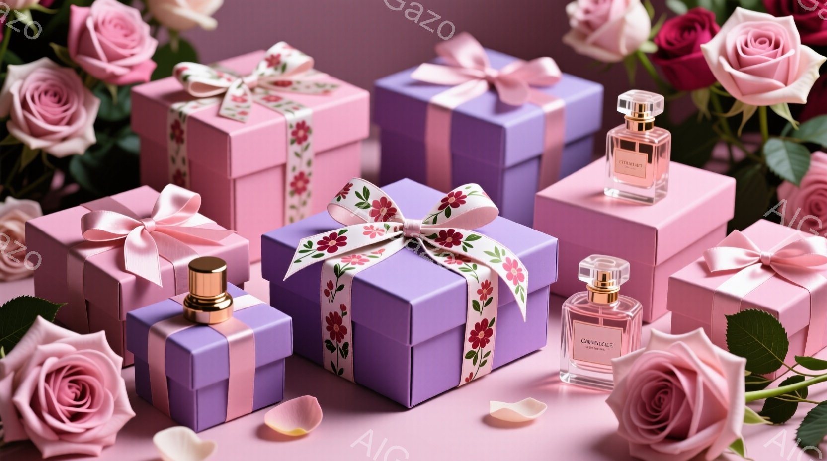 明るいラベンダー色とピンク色のギフトボックスが、ピンクと白の花束と共に配置されています。ギフトボックスには、花柄のリボンが結ばれており、香水瓶がいくつか添えられています。全体的に華やかでフェミニンな雰囲気で、贈り物や特別な日のイメージを想起させます。