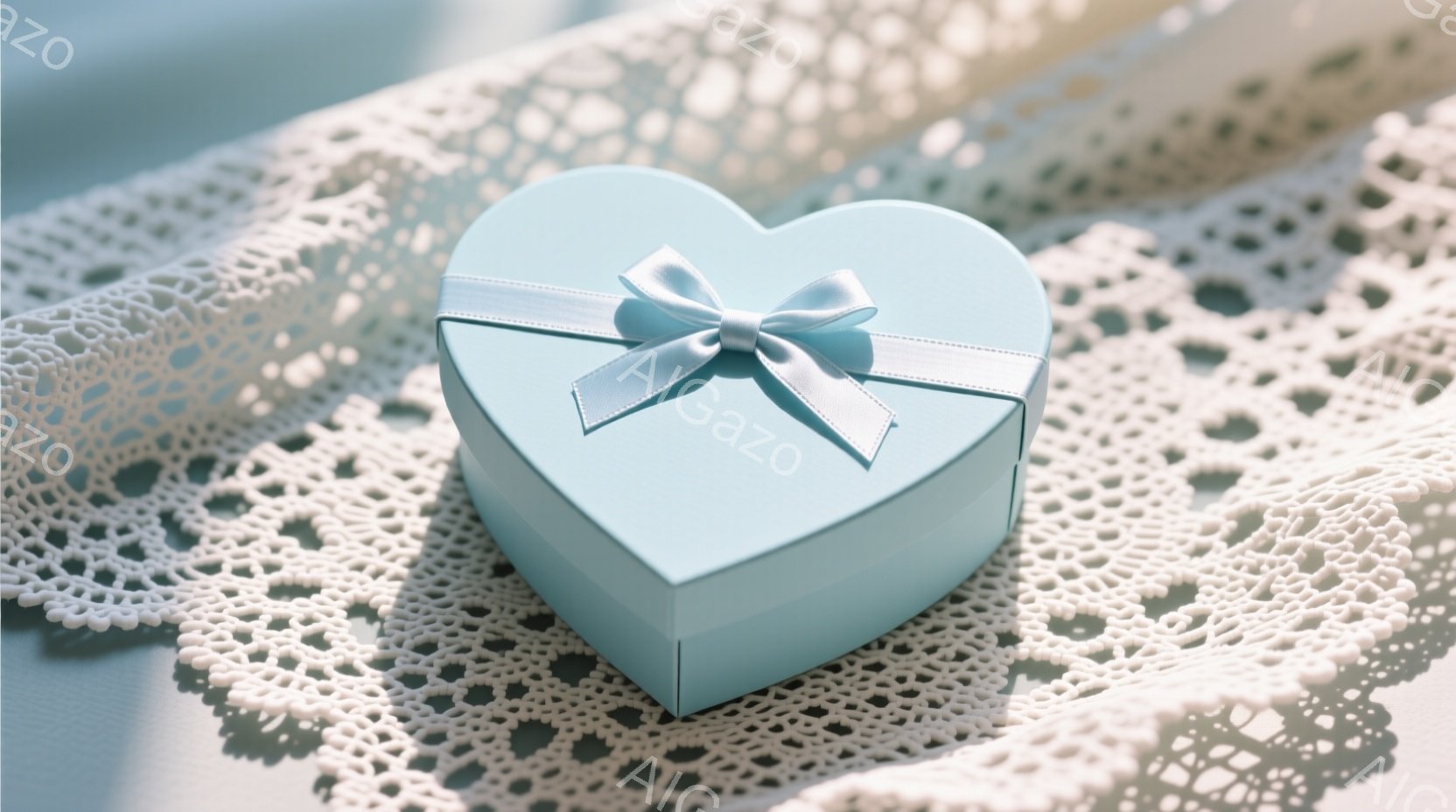 薄い水色のハート型の箱が、繊細なレース編みのドイリーの上に置かれています。箱は少し影を落としており、レース編みの模様が光と影で際立っています。全体的に柔らかい雰囲気で、愛情や贈り物を連想させる穏やかなイメージです。