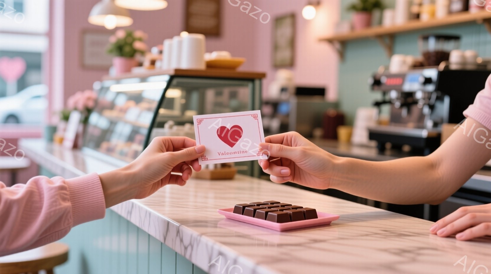 バレンタインデーのカードが二人の手の間に掲げられています。背景には、チョコレートが並んだトレイと、ピンクを基調とした可愛らしいカフェのカウンターが見えます。全体的に、甘くてロマンチックな雰囲気が漂っています。