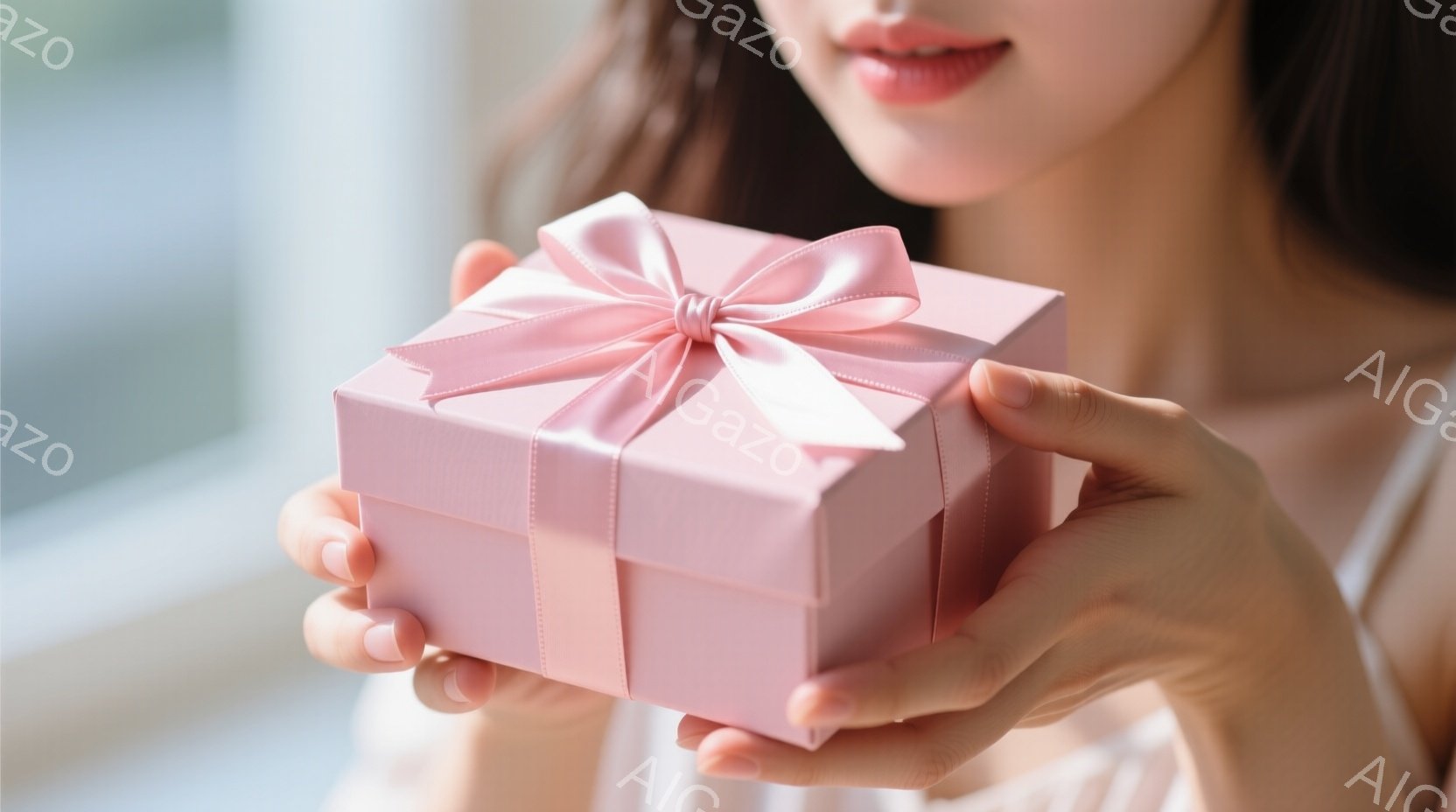 薄いピンク色のギフトボックスを両手で持っている女性が写っています。彼女は白いキャミソールを着ており、髪は後ろでまとめられています。背景はぼやけていますが、明るい室内であることはわかります。