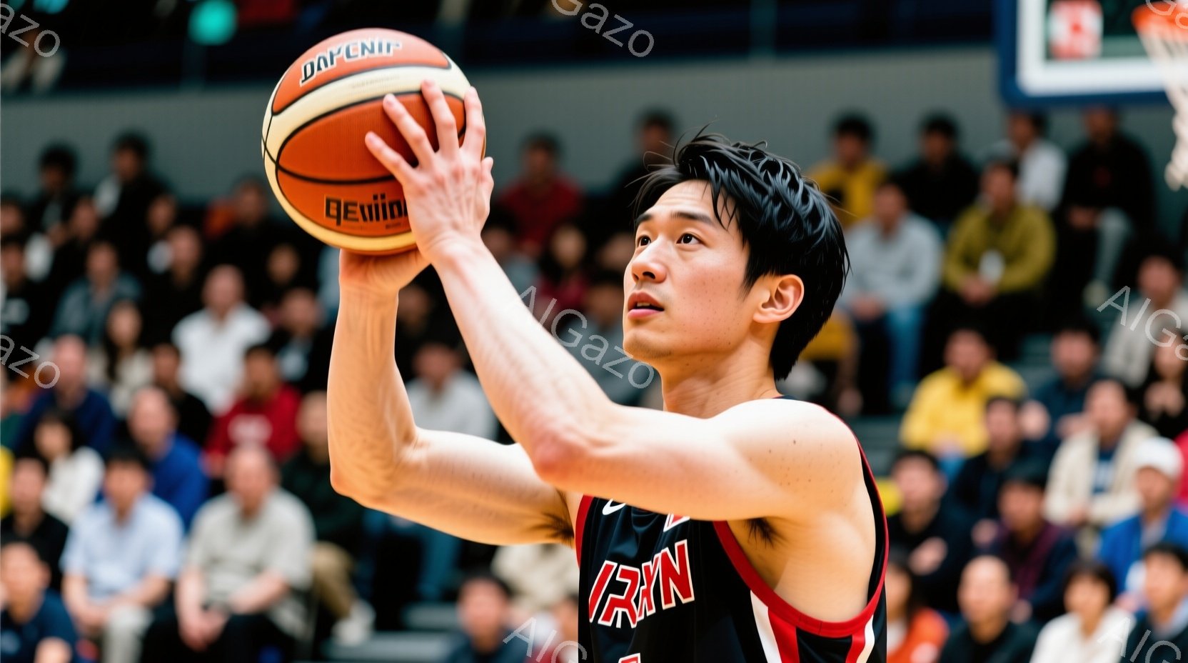 バスケットボール選手がジャンプシュートを打とうとしている瞬間を捉えた写真です。彼は赤いタンクトップと黒いショーツを着用し、黒髪を短く整えています。背景には観客席がぼやけて写っており、試合の熱気が感じられます。