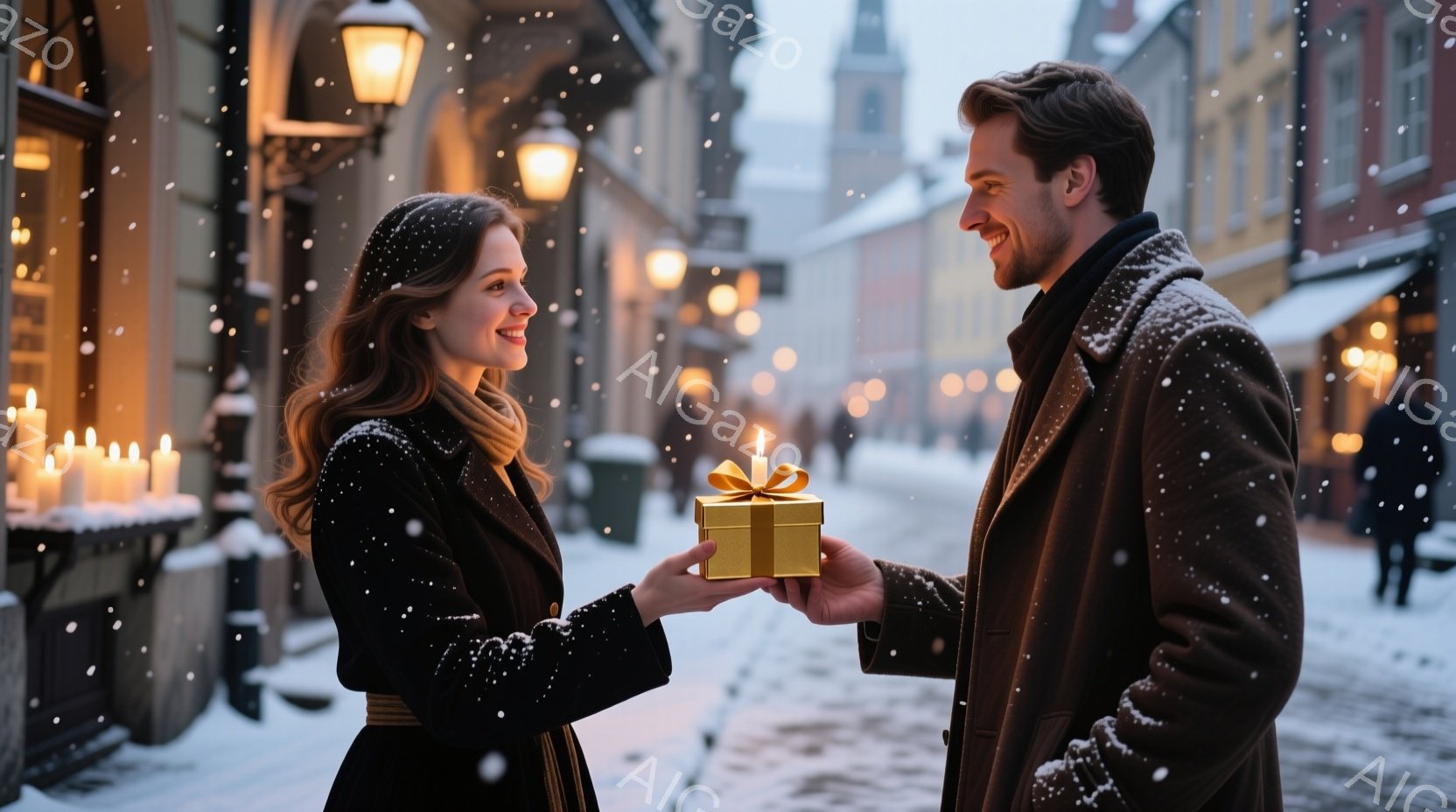 雪が舞う街中で、女性が男性からプレゼントを受け取ろうとしている場面です。女性は黒いコートにオレンジ色のスカーフを巻き、長い茶髪を肩にかけ、微笑んでいます。男性は茶色のジャケットを着ており、笑顔でプレゼントを差し出しています。背景には石造りの建物と、点灯されたキャンドルが並んだショーウィンドウが見え、ロマンチックで温かい雰囲気が漂っています。