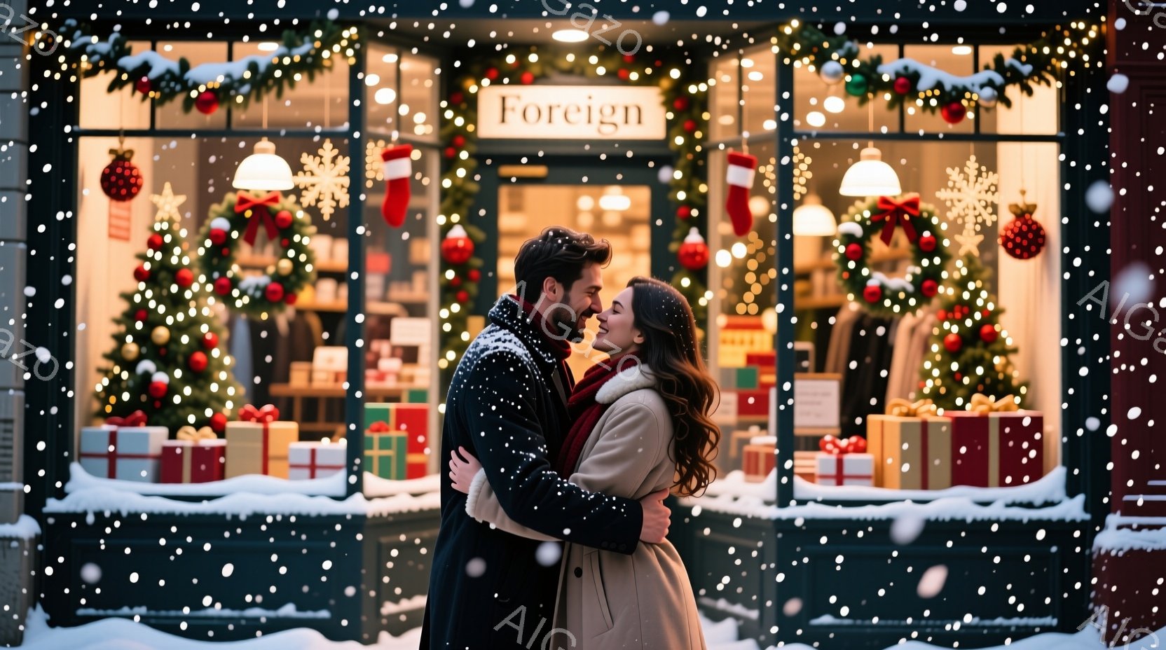 雪が舞う街中で、コートを着た男女が抱き合って微笑み合っている。女性は赤色のコートに長い巻き毛の髪型で、男性は濃い色のコートを着て少し無精髭を生やしている。背景にはクリスマス装飾が施された店があり、暖かくロマンチックな雰囲気が漂っている。