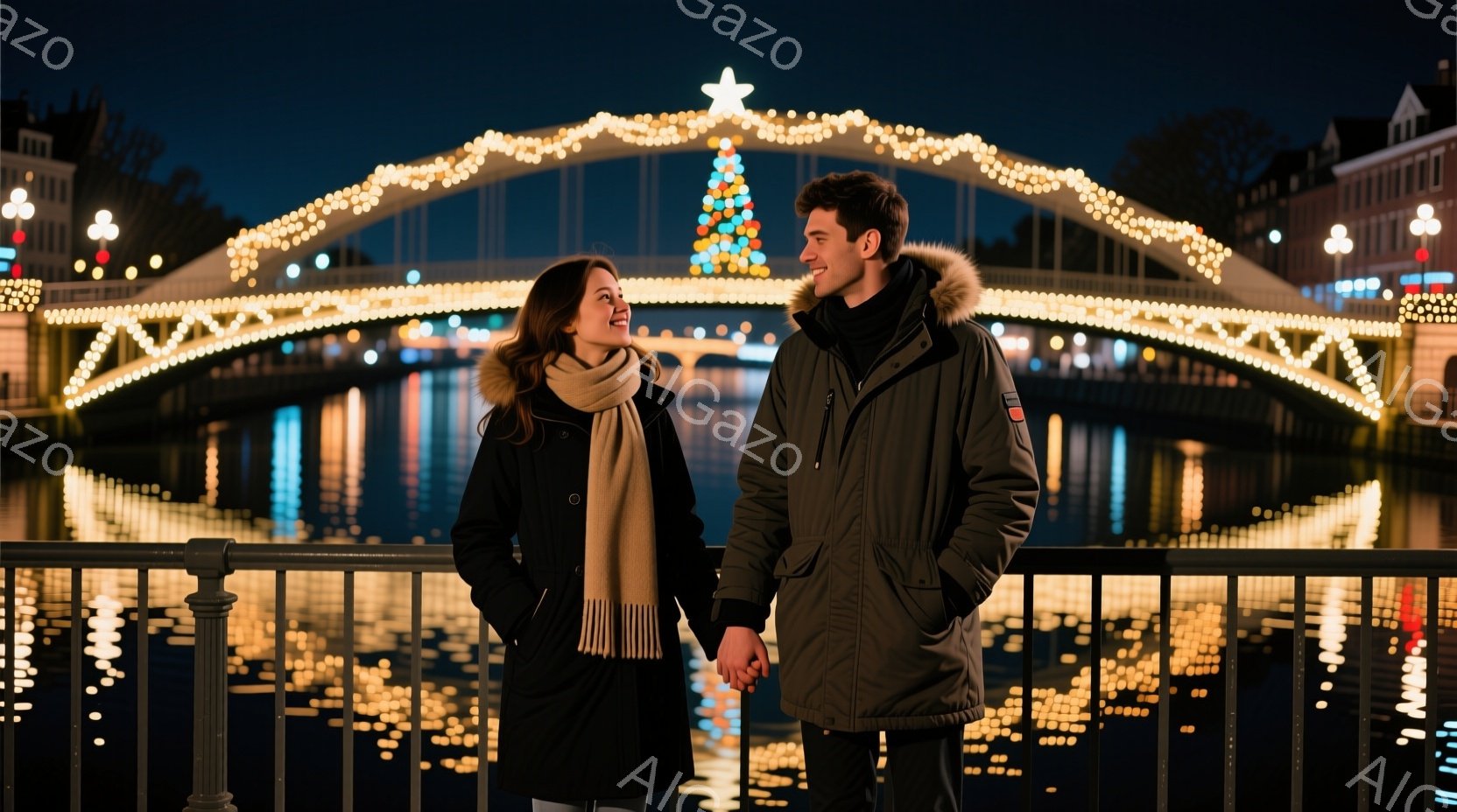 雪が降る公園のベンチに、若い男女が並んで座っている。女性はベージュのコートに赤茶色のスカート、男性はダークブラウンのコートを着ており、二人とも笑顔で楽しそうに相手を見つめている。背景にはクリスマスツリーが飾られ、夕焼け空が雪景色に暖かさを添えている。