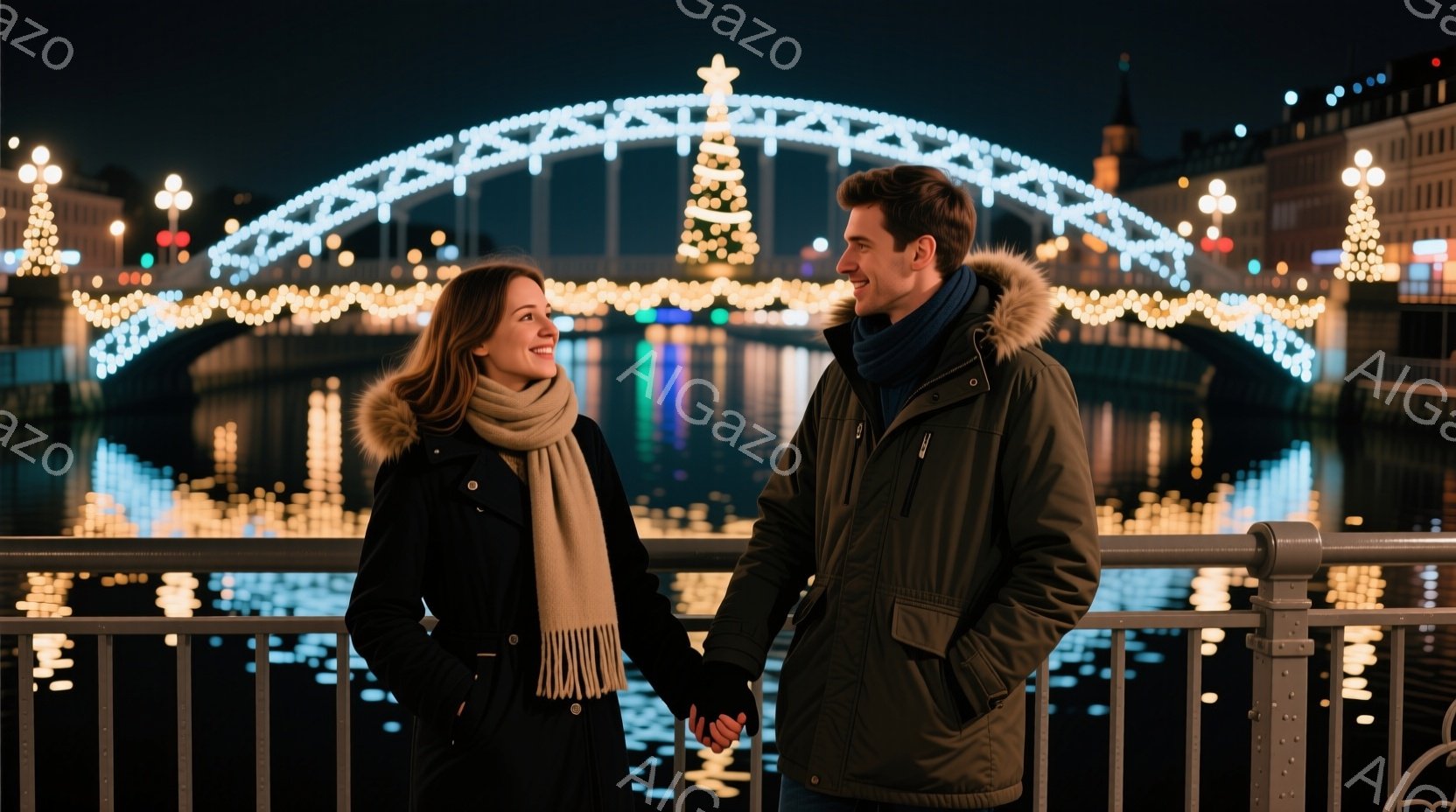川にかかる橋の前で手をつないでいる若いカップルが写っています。女性は黒いコートにオレンジ色のスカーフを巻き、髪は肩まで伸びています。男性は黒いセーターの上に厚手の黒い冬用コートを着ており、二人とも顔には微笑みが浮かんでいます。
