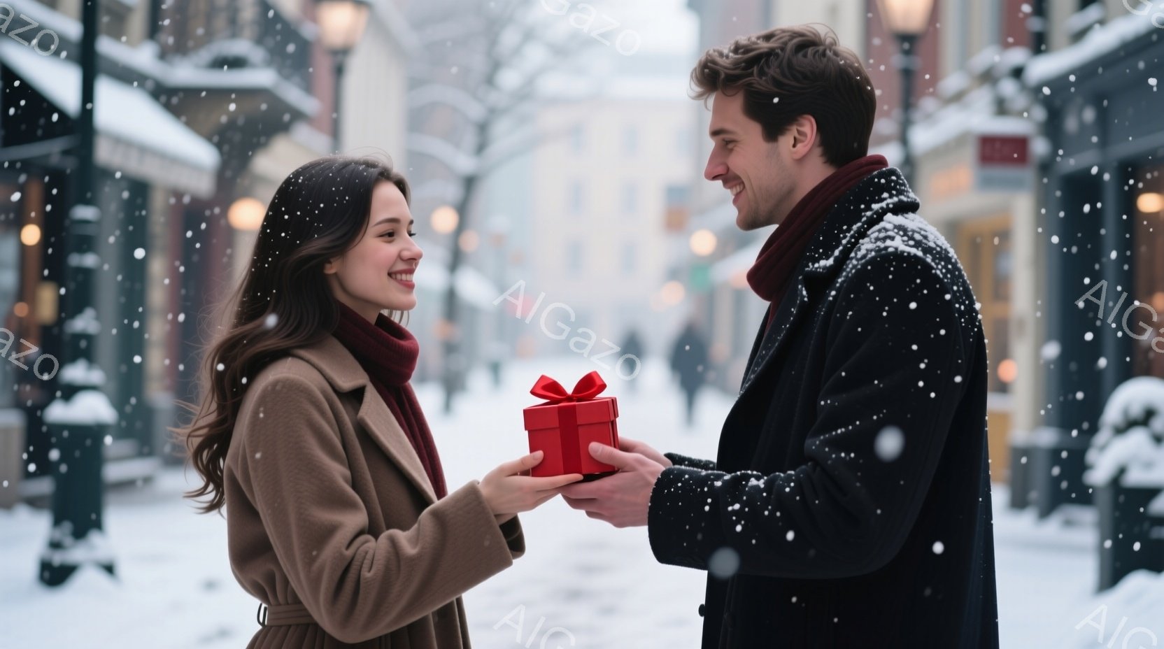 暖かいチェック柄のマフラーを巻いた男性と、長い巻き毛の女性が、雪が降り積もる夜景を見下ろしている。背景にはきらめく都市の明かりと、遠くで打ち上げられる花火が広がり、クリスマスの飾り付けが施された木々が暖かさを添えている。雪景色と光のコントラストが、ロマンチックで穏やかな雰囲気を醸し出している。