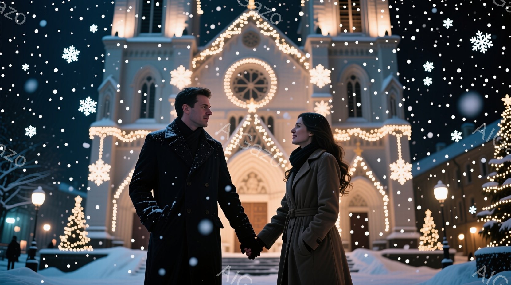 雪が降る夜、教会を背景に男女が手をつないで立っている。男性は黒の長いコートを着ており、女性はベージュのコートを着ている。教会のファサードは、暖かい光で飾られた電飾で美しく彩られ、周囲にはクリスマスツリーが飾られている。